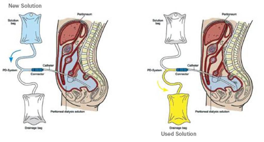 In renal failure, waste products, such as urea can be dialyzed by infusing the peritoneal cavity with a dialysis solution, which then can be removed after waste products have diffused from the blood into the peritoneal cavity.