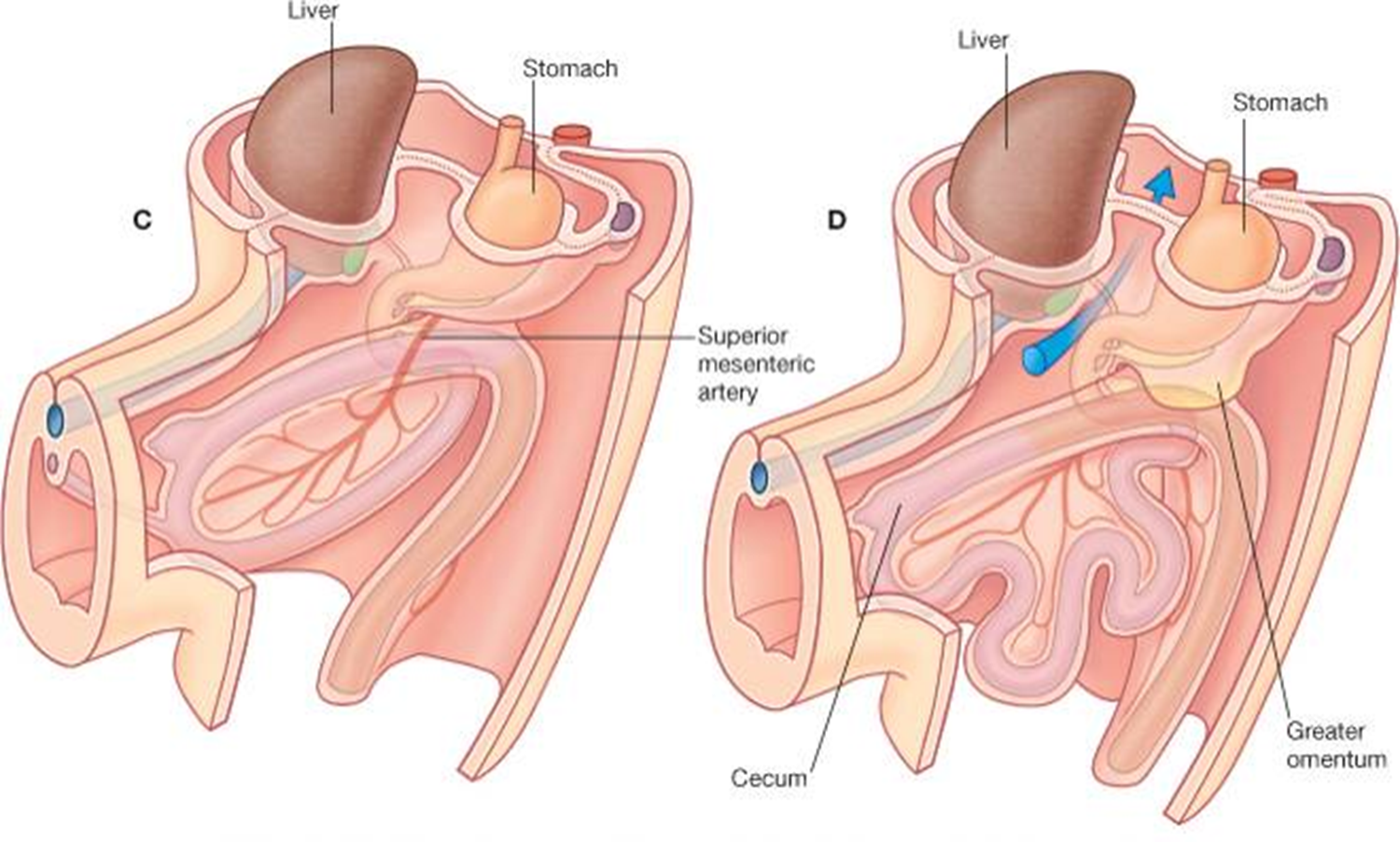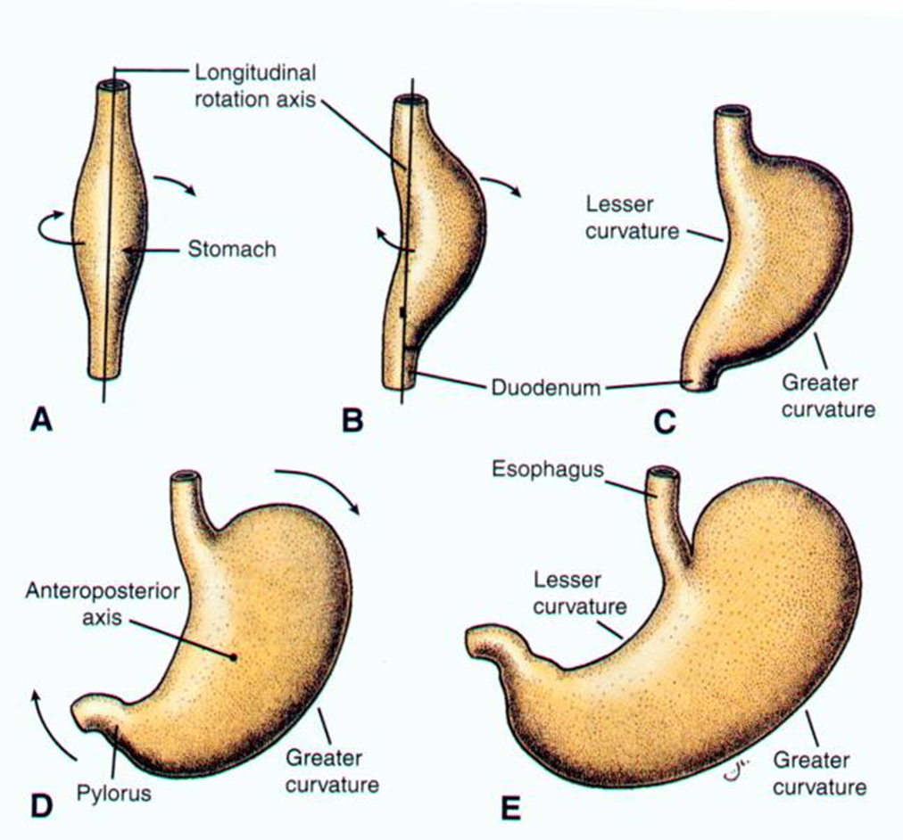As the stomach grows, it rotates slowly, 90° clockwise around its longitudinal axis