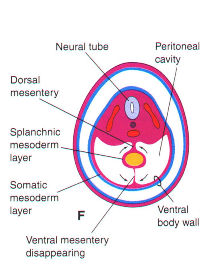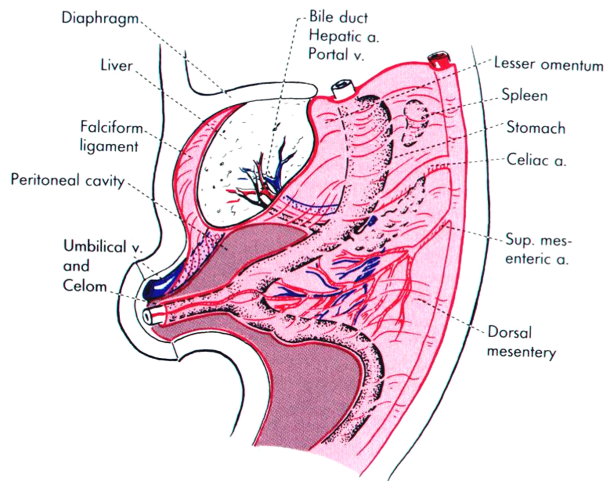 Ventral mesentery: Exists only in the region of the terminal part of the esophagus, the stomach, and the upper part of the duodenum