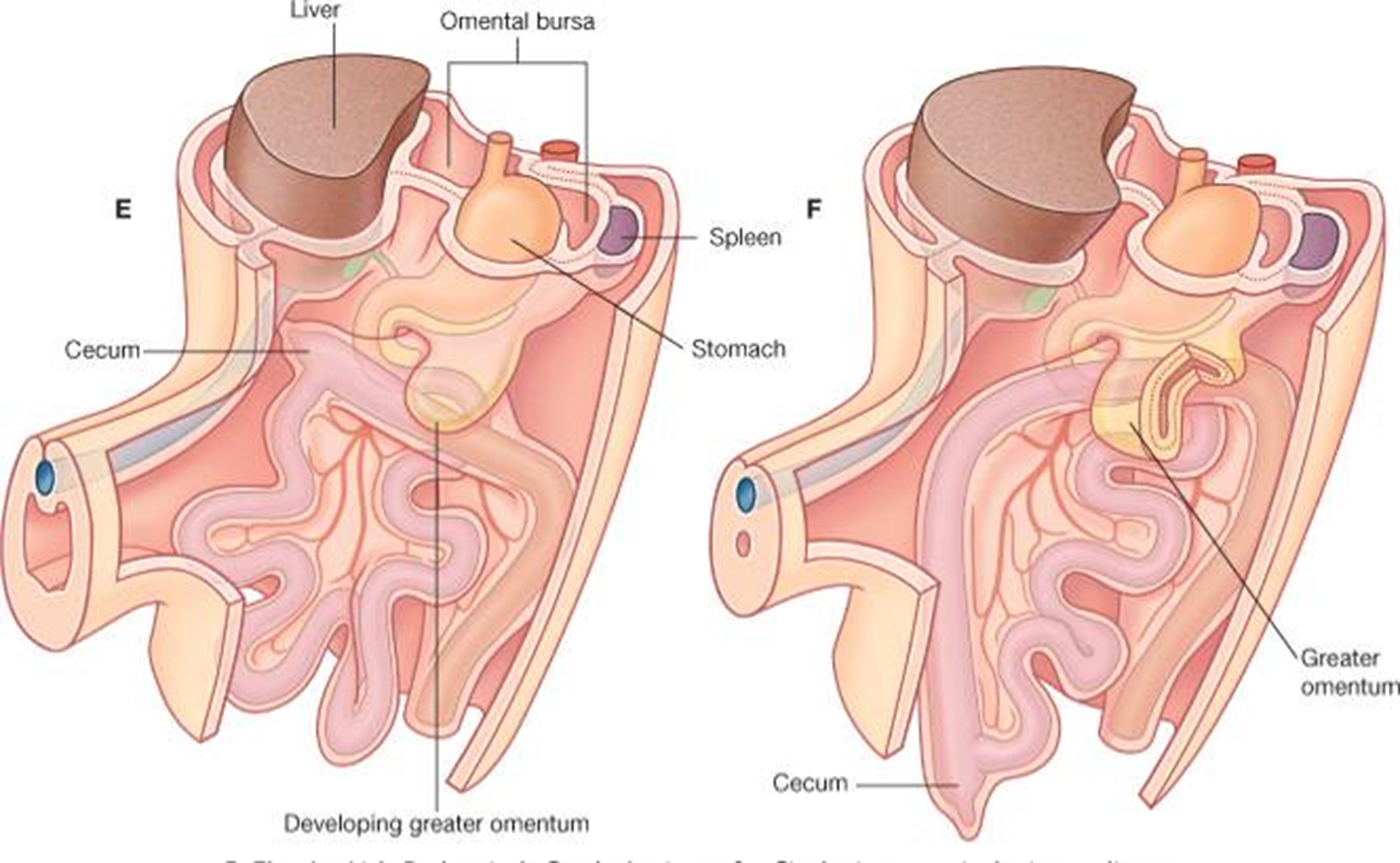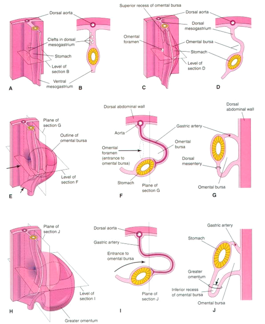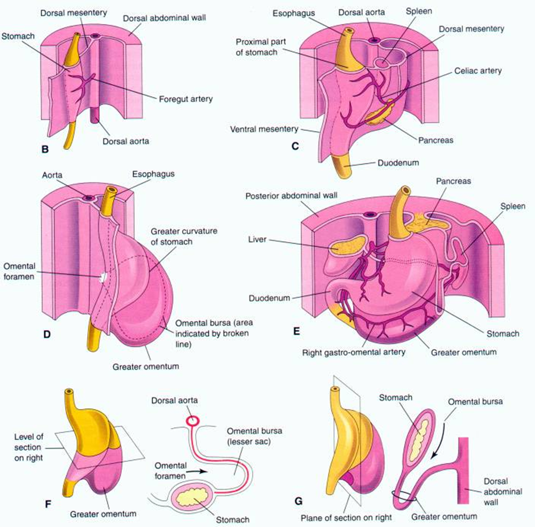 Differential growth of the stomach, rotation of the stomach, and extensive growth of the dorsal mesogastrium (mesentery), which forms the greater omentum and related structures, contribute to the formation of the lesser sac