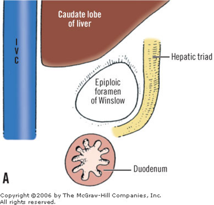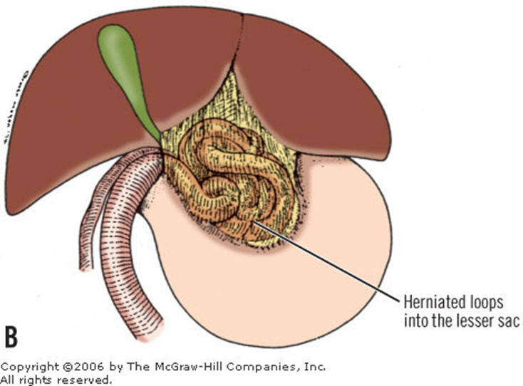 Rarely, a loop of bowel can herniate into the foramen of Winslow causing strangulation and necrosis of the bowel