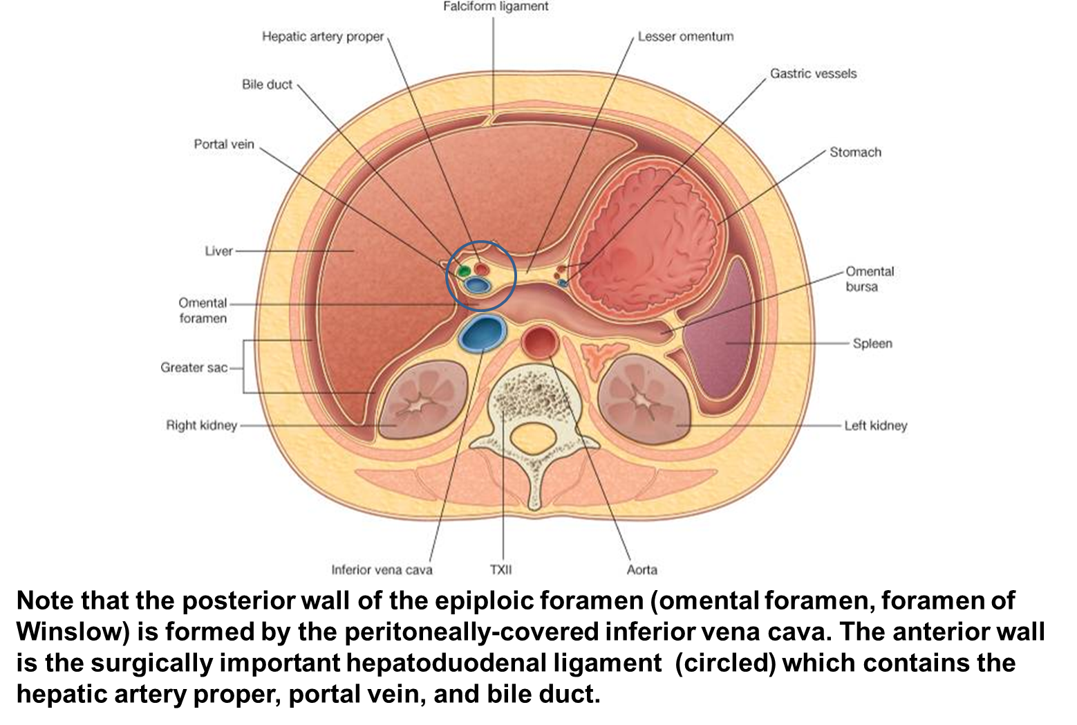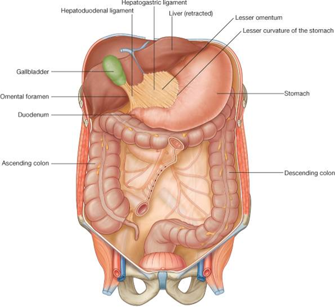 Lesser omentum: Free margin is the hepatoduodenal ligament which houses the hepatic artery, common bile duct and the portal vein
