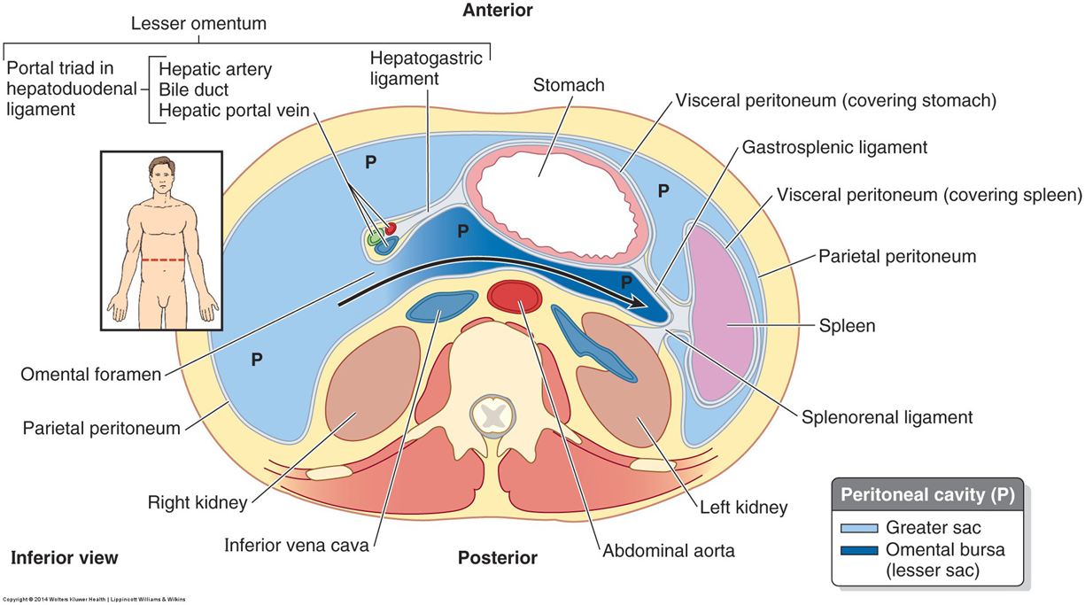 The omental bursa or lesser sac can fill with fluid as a result of ulceration of the posterior wall of the stomach or as a result of pancreatitis