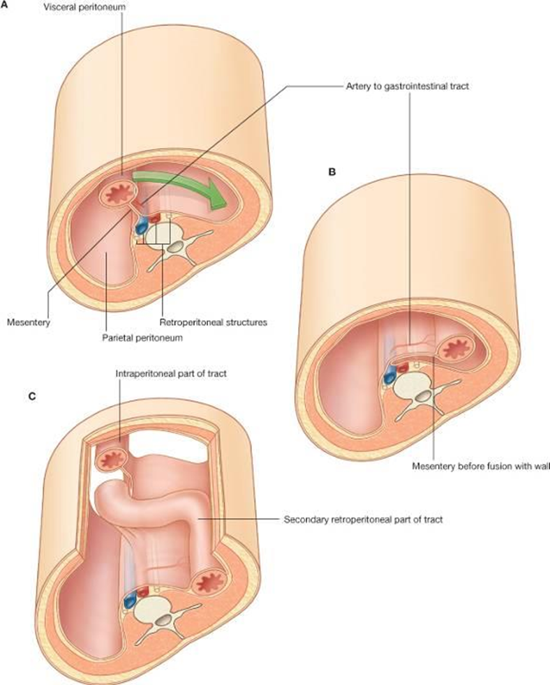 GI tract development pushes some organs against the posterior body wall. The splanchnic peritoneum fuses with the parietal peritoneum of the posterior body wall.