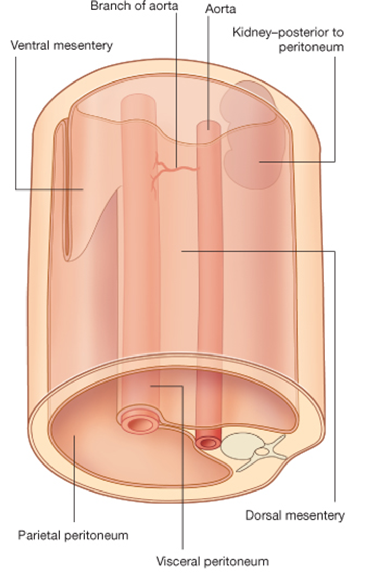 The folding of the embryo leaves the primitive gut as a tube suspended in the primordial abdominal cavity by mesenteries