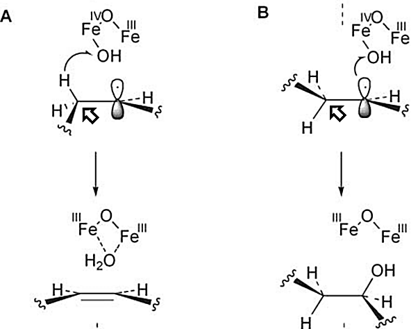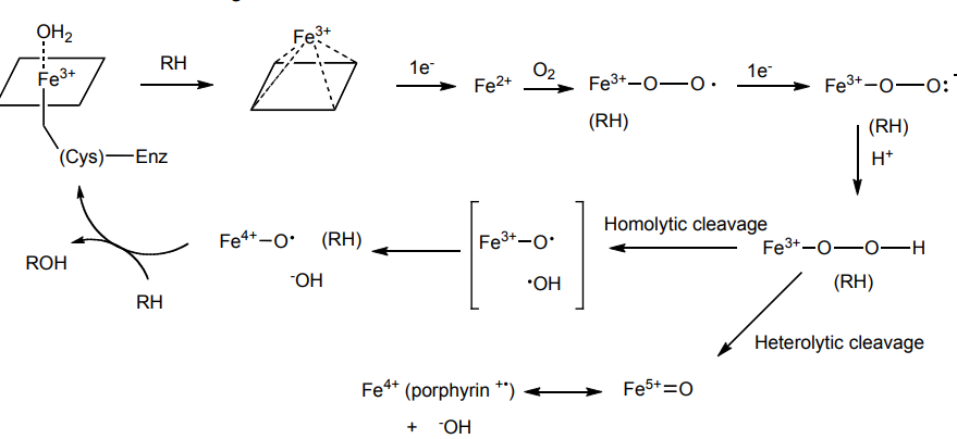 1st step→ low spin→ high spin cause of binding makes reduction easier→ electron transfer chain →generate radical neutral species using acid/ base chemistry → O is radical species cause of Fe electron transfer in res. →oxygen rebound to get products