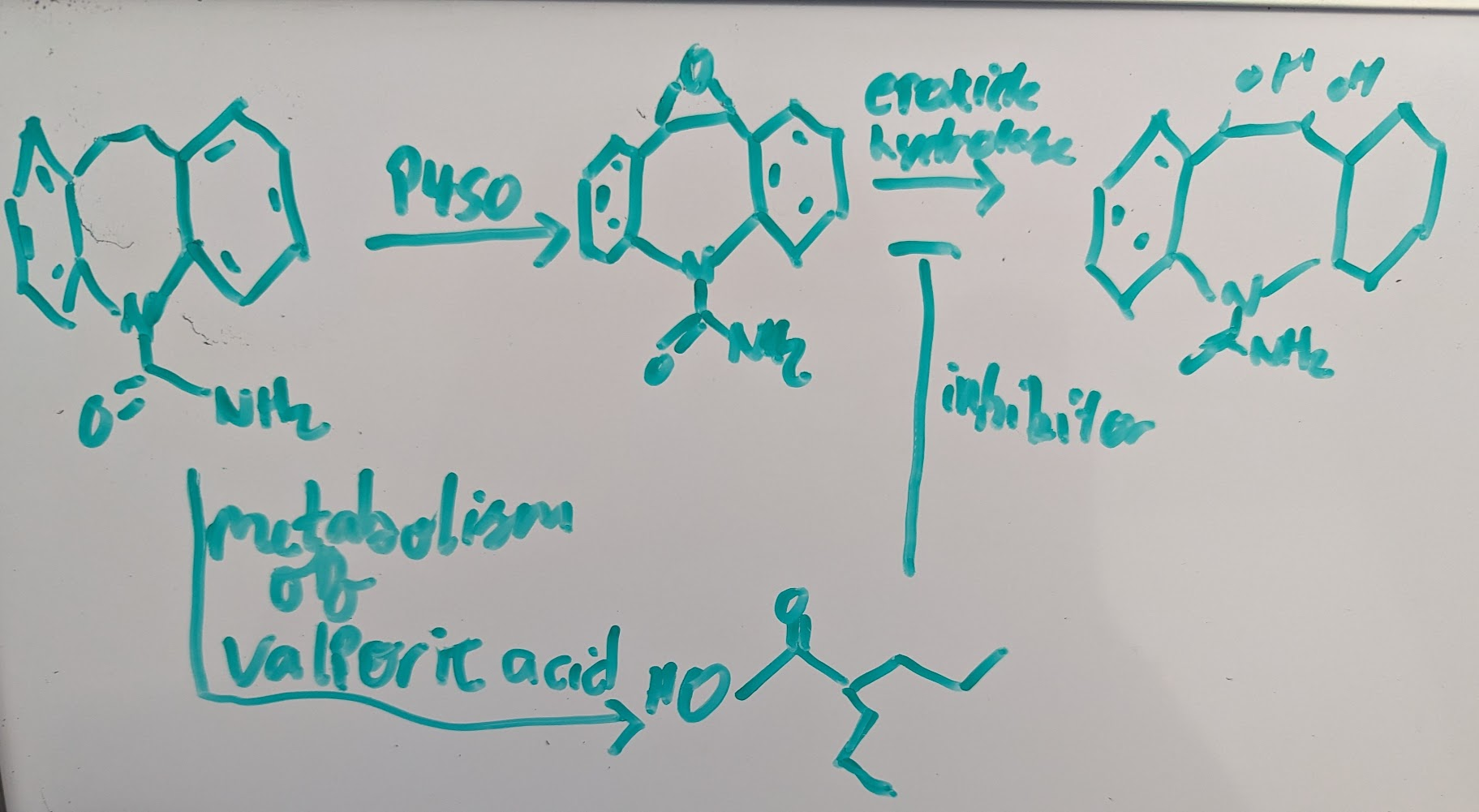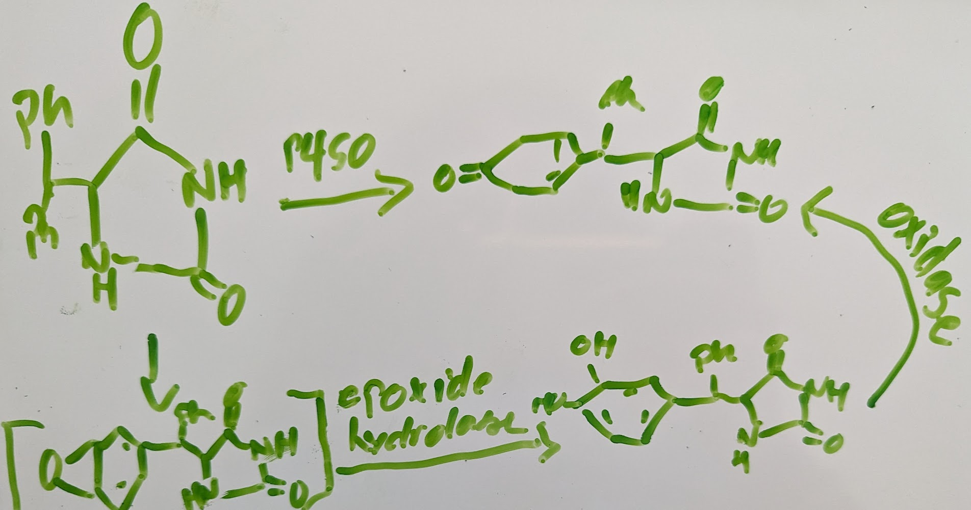 phenytoxin and toxicity→ found to fetal hydantoin syndrome→ when used it inhibits epoxide hydrolase can decrease side affects