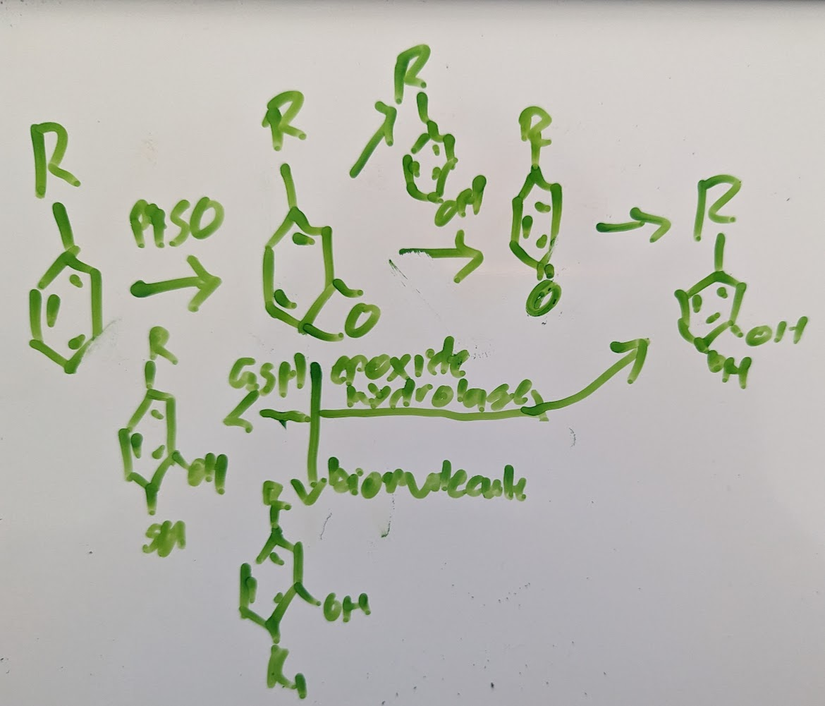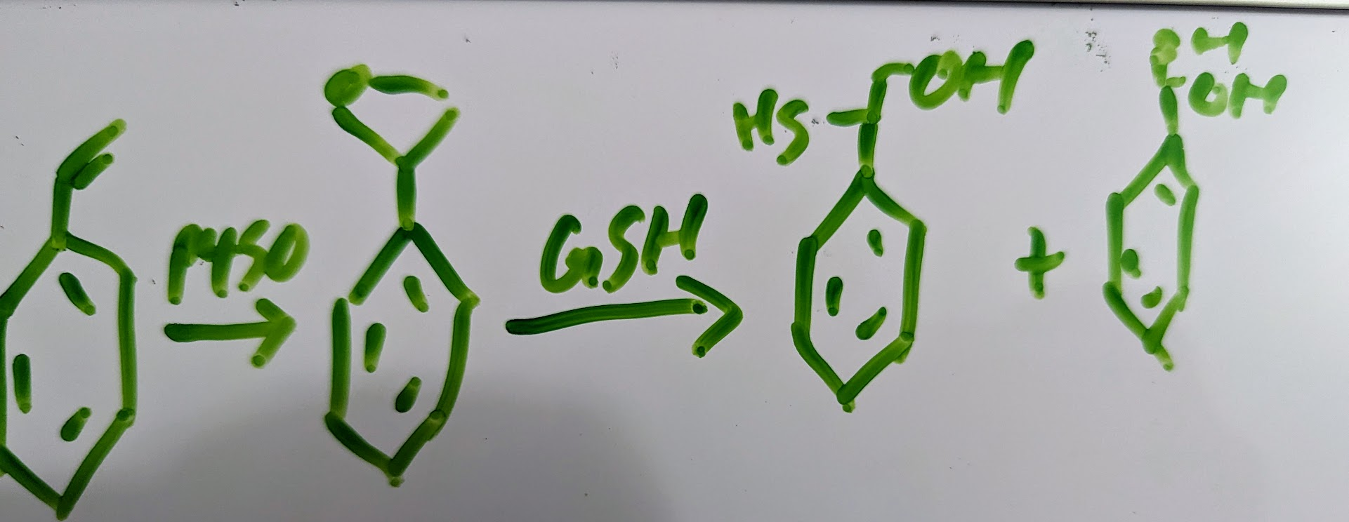 study metabolism of aromatic compounds using Br-Ar showed that after P450 the arene oxide made is trapped by GSH where a glycine is added and converted into a cystine after which the compound leaves in urine