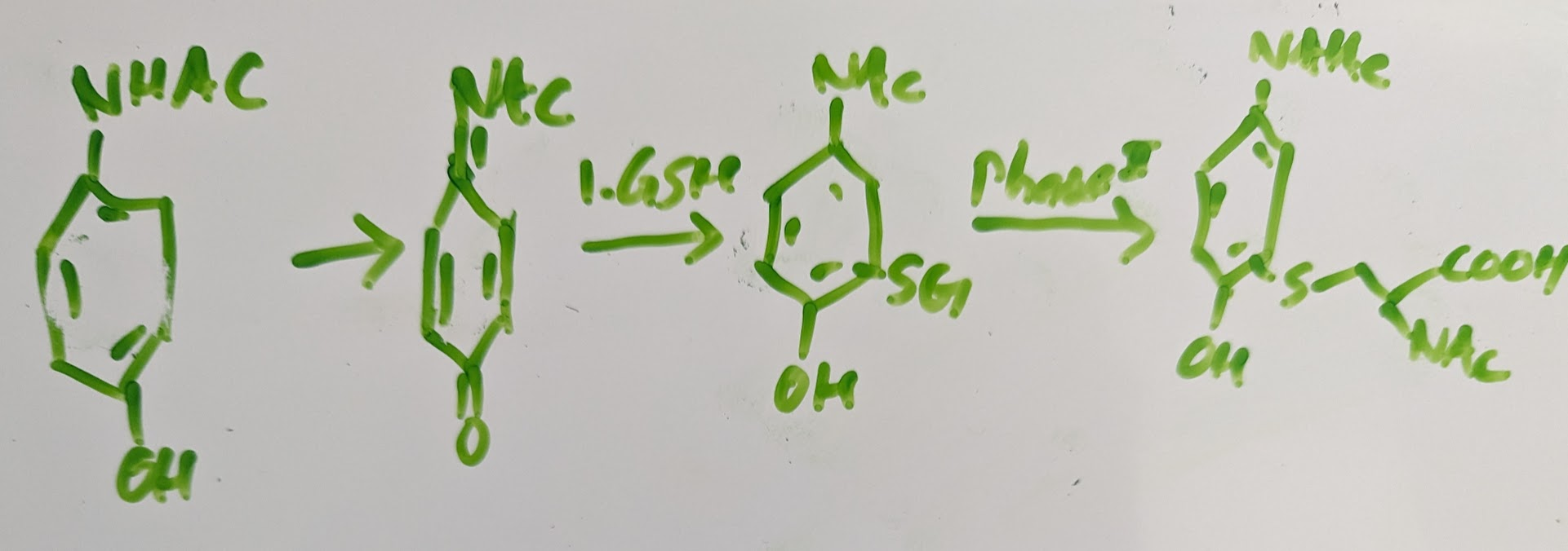 when GSH is overwhelmed it can’t deal with the acetaminophen leading ODOAT( organic anion transporter) used to transport things from kidney to blood
