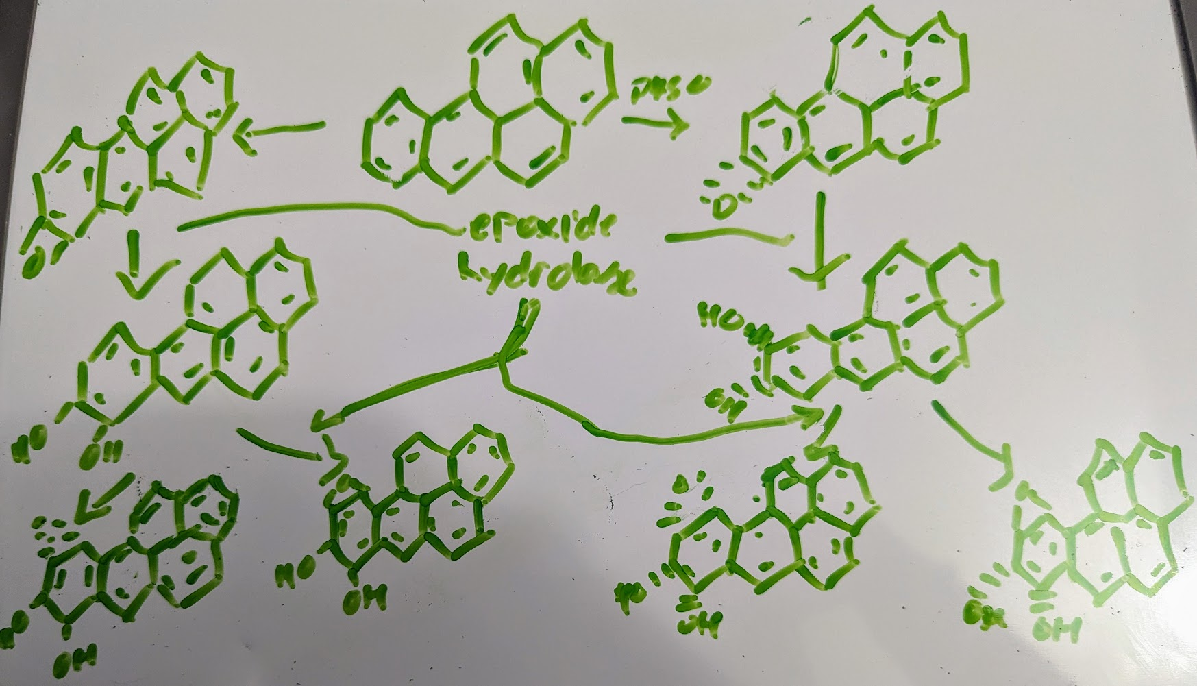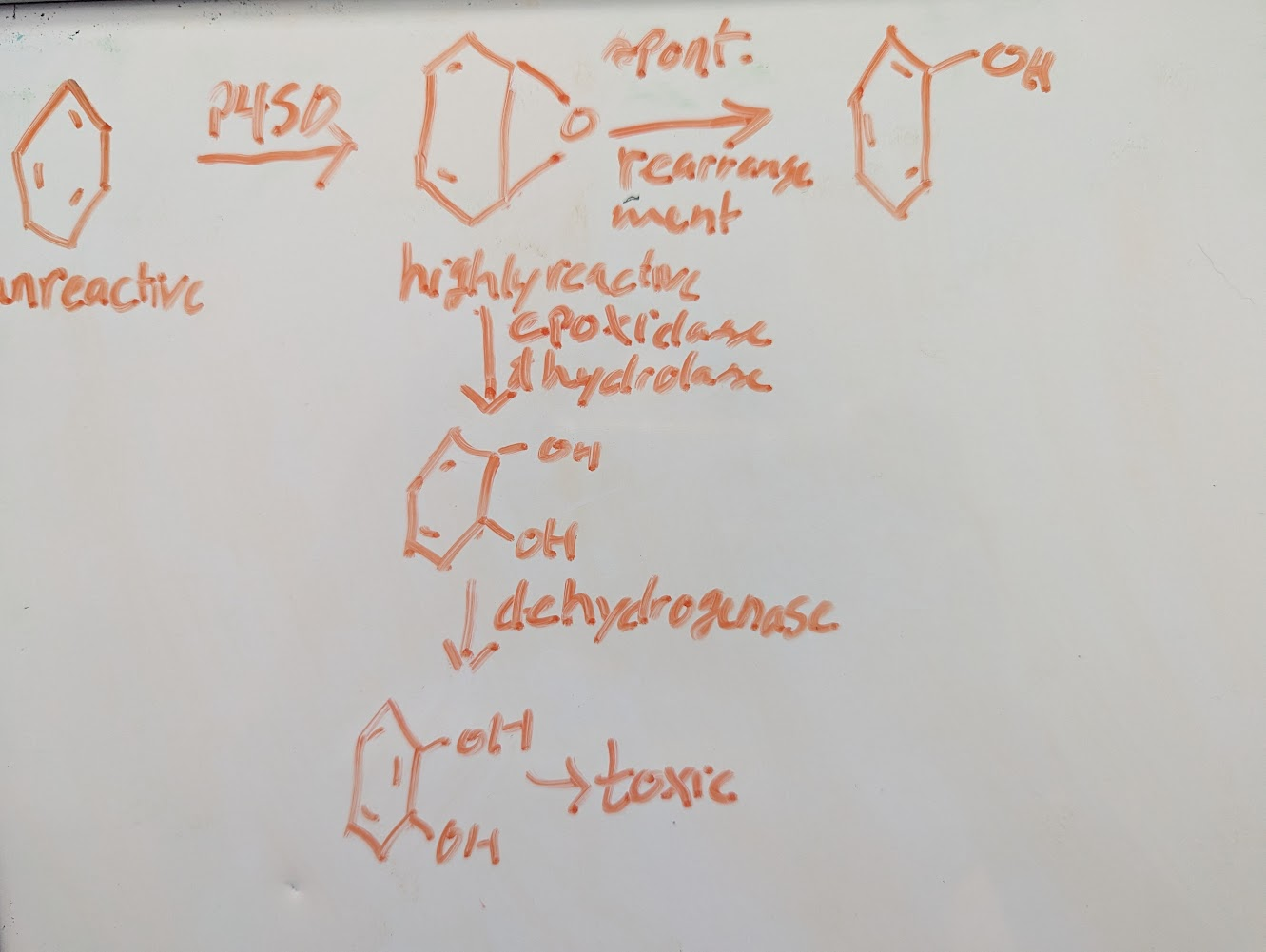 benzene is a carcinogen and toluene isn’t because toluene once metabolized by p450 can easily go through phase 2 metabolism but benzene becomes a super stable arene oxide which can lead to radical propagation and other issues