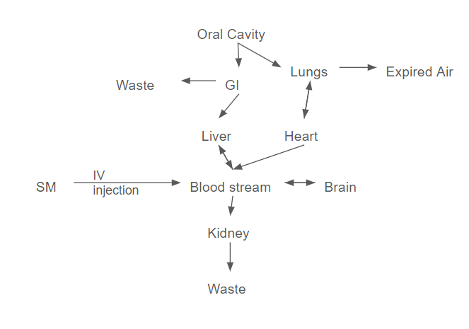 exposure to the skin from water, soil, drug, subcutaneous (s.c) or in intramuscular (SM)