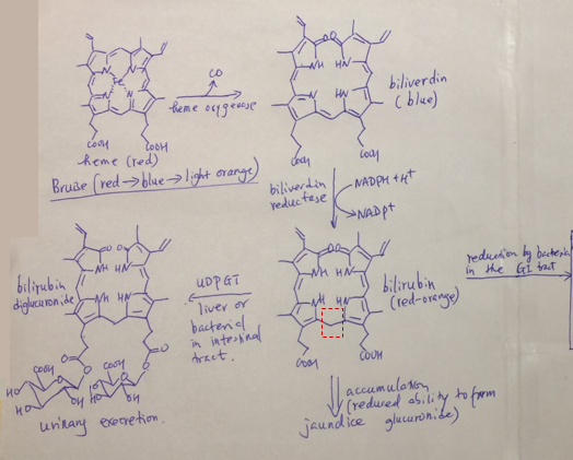 CO2 leaving with the help of heme oxygenase is what turns bruise blue created biliverdin→ bilirubin give it a light orange hueif bilirubin is glucuronidated it is excreted through urine
