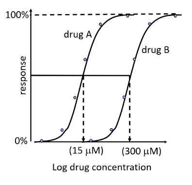 e.g. dose A is 1um, dose B is 51mm; dose A is more potent, less drug is needed produce the same 50% response