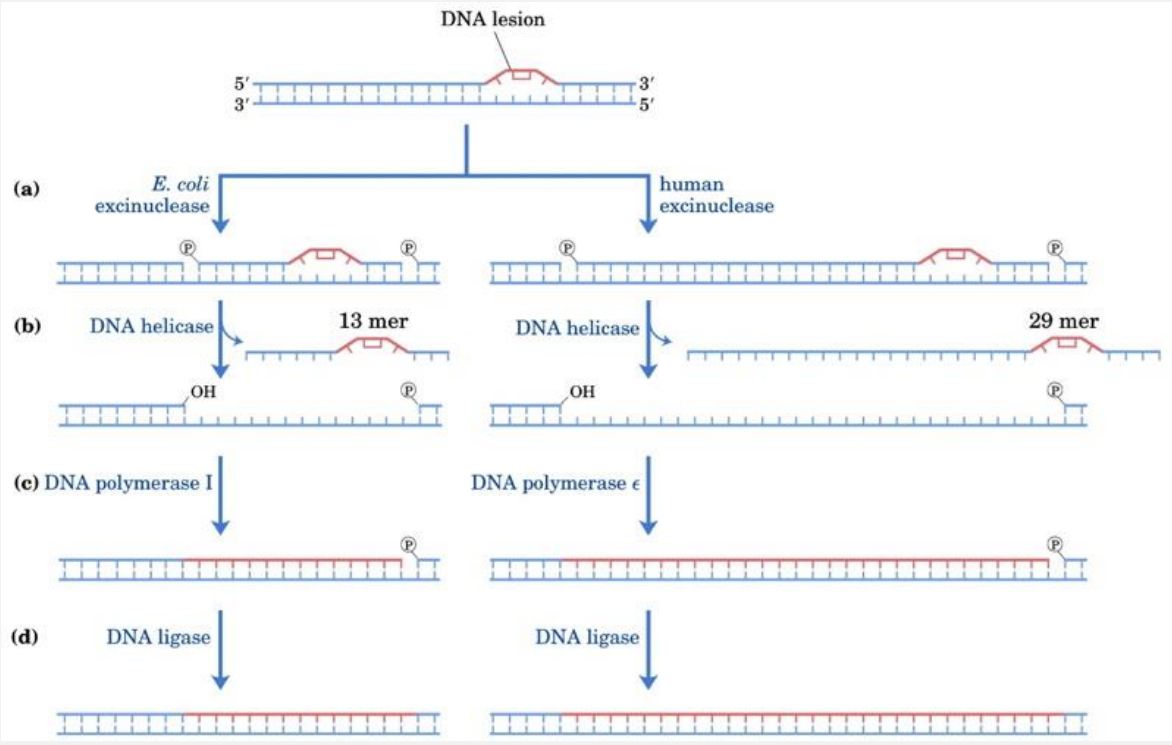 This results in the removal of an ~30 residue single -stranded oligonucleotide containing the damage.