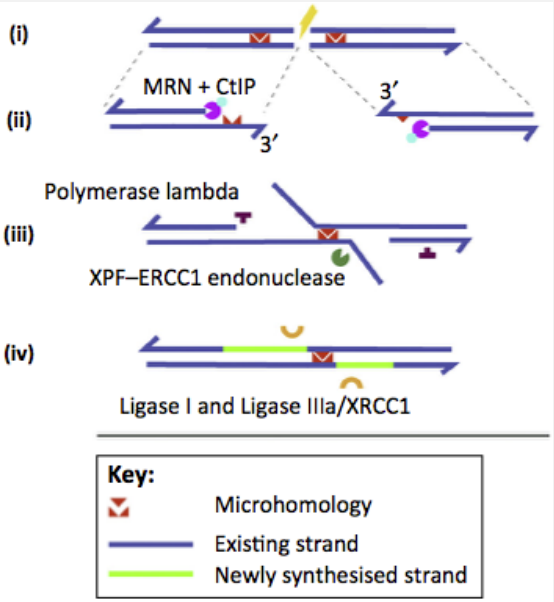 annealing of the microhomologous sequences, trimming of the noncomplementary 3’ flaps, gap filling (iii)