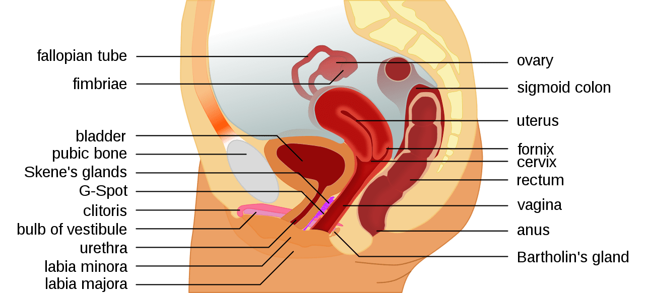 The cervix is at the tip of the uterus with the remaining structures including the vagina and outer vulva which contain the labia major and minor and clitoris.