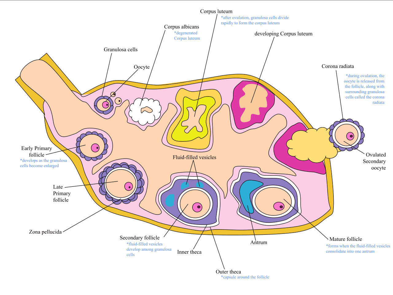 The oocytes develop by way of a process called oogenesis. During oogenesis a primary oocyte develops into a secondary oocyte. The primary oocyte is diploid, so it contains all 46 chromosomes. As it undergoes meiosis it becomes a haploid secondary oocyte which only contains 23 chromosomes. The other 23 chromosomes are eliminated as a polar body. Here maturation ceases unless fertilization occurs which produces a zygote which again has 46 chromosomes—23 from the female and 23 from the male.