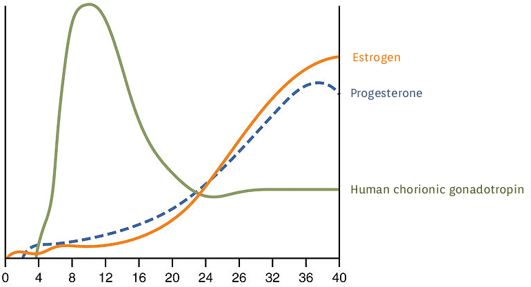 The outer layer of the blastocyst or trophoblast secretes human chorionic gonadotrophin (hCG) hormone which directs the corpus luteum to survive, enlarge, and continue producing progesterone and estrogen to suppress menses.