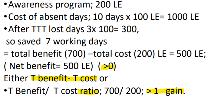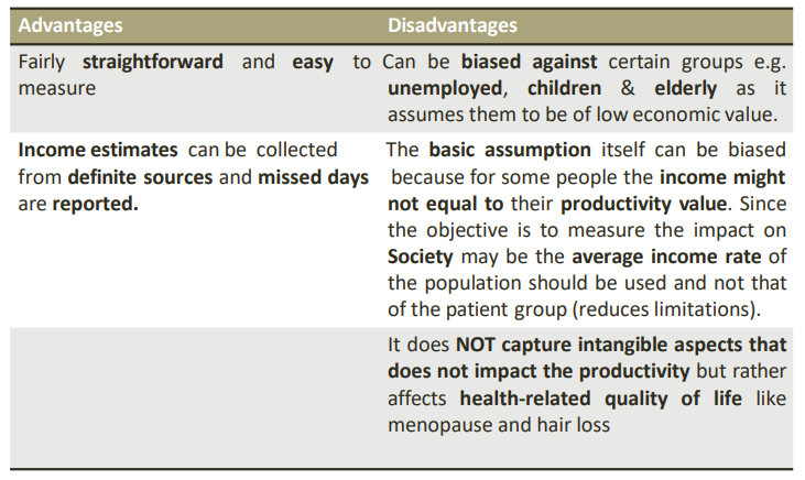 Measures cost benefit in productivity level. It assumes that the VALUE of health benefits EQUAL the economic PRODUCTIVITY they permit. Done by estimating wage loss due to illness, disability or death (absent days).