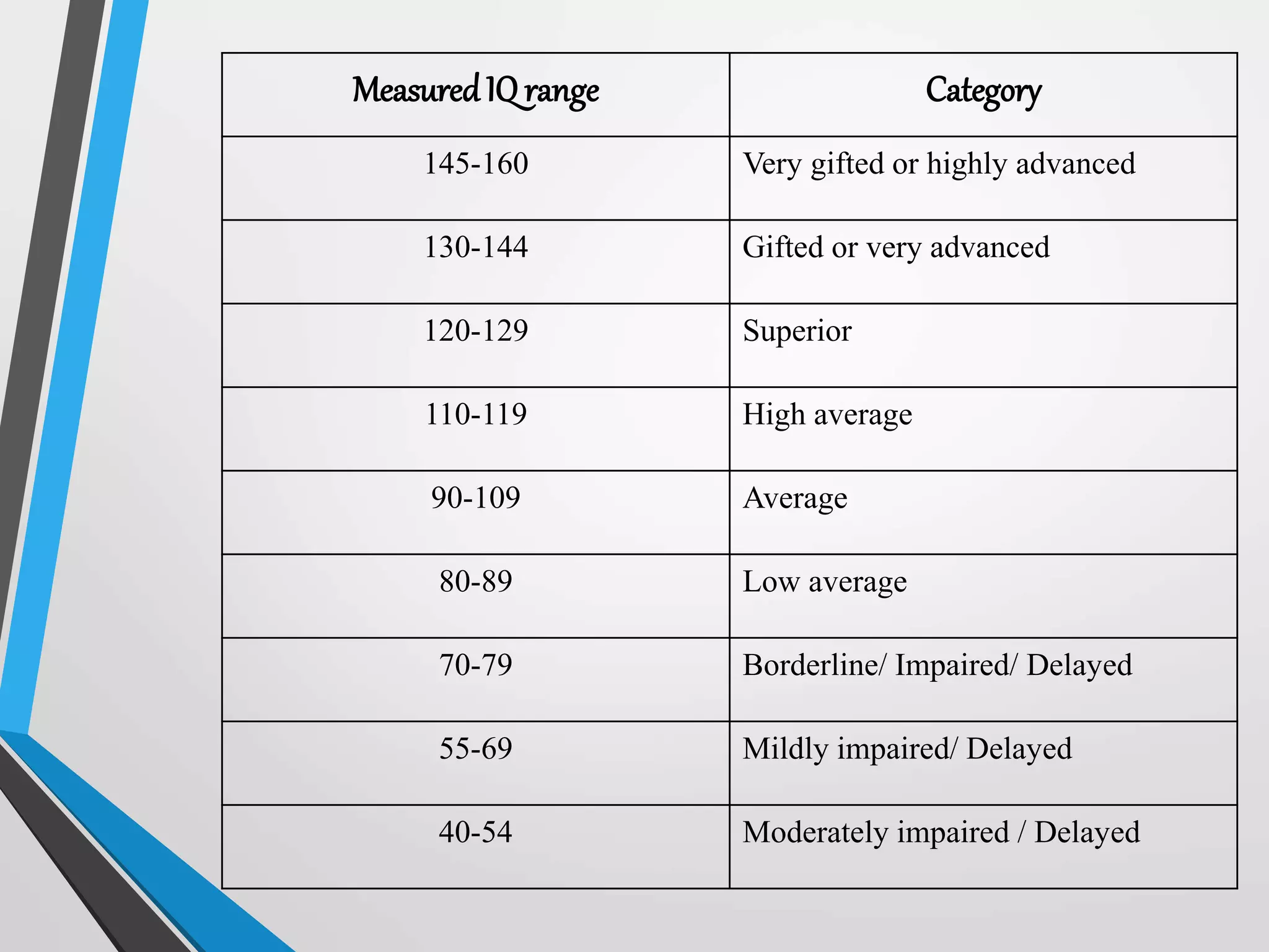 Very gifted, gifted, superior, high average, average, low average, borderline impaired, mildly impaired, moderately impaired.