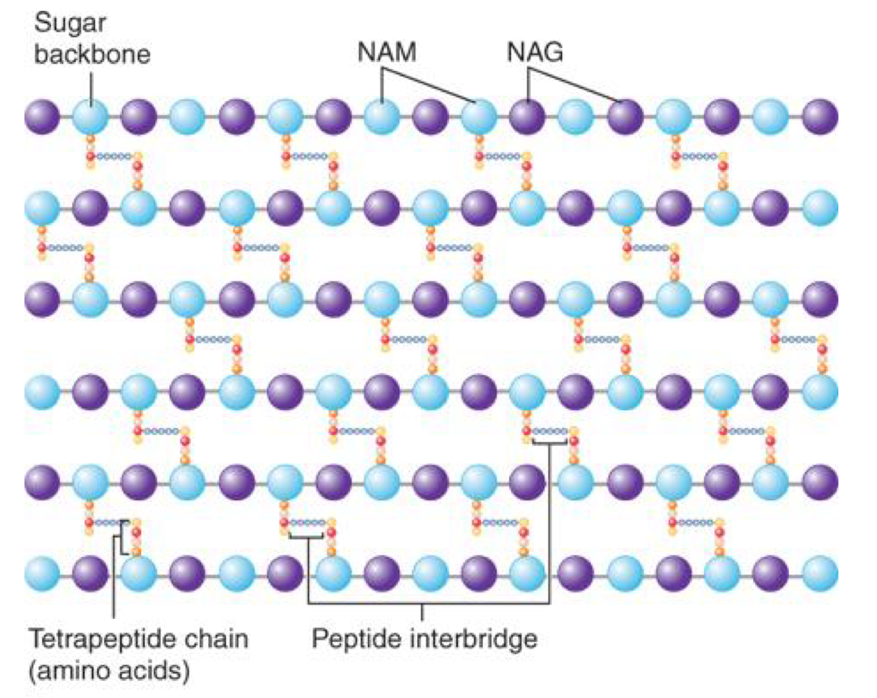 a carbohydrate backbone of alternating units of NAG (N-acetylglugosamine) and NAM (N-acetylmuramic acid) residues linked to peptide