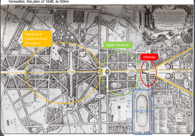 Vaux le Vicomte (1661): This was the first major work of Le Notrê, which prioritized landscape over architecture, featuring grand canals and unexpected vistas that created an atmosphere of surprise and admiration.