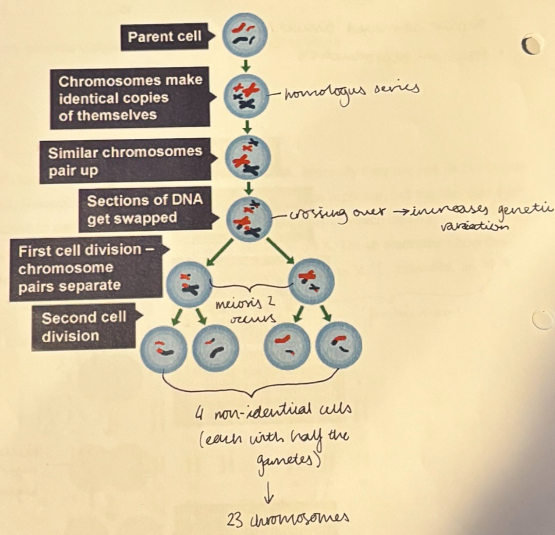 Meiosis | Cell Division – the cell divides twice to form 4 genetically different daughter cells. These cells only have half of the genetic information of the original parent cells |
