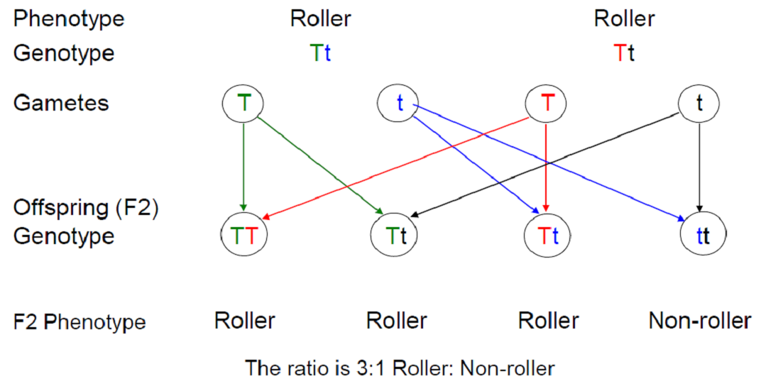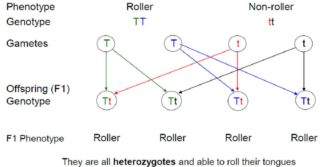 Example: Tongue rolling gene – allele T allows rolling, t does not.