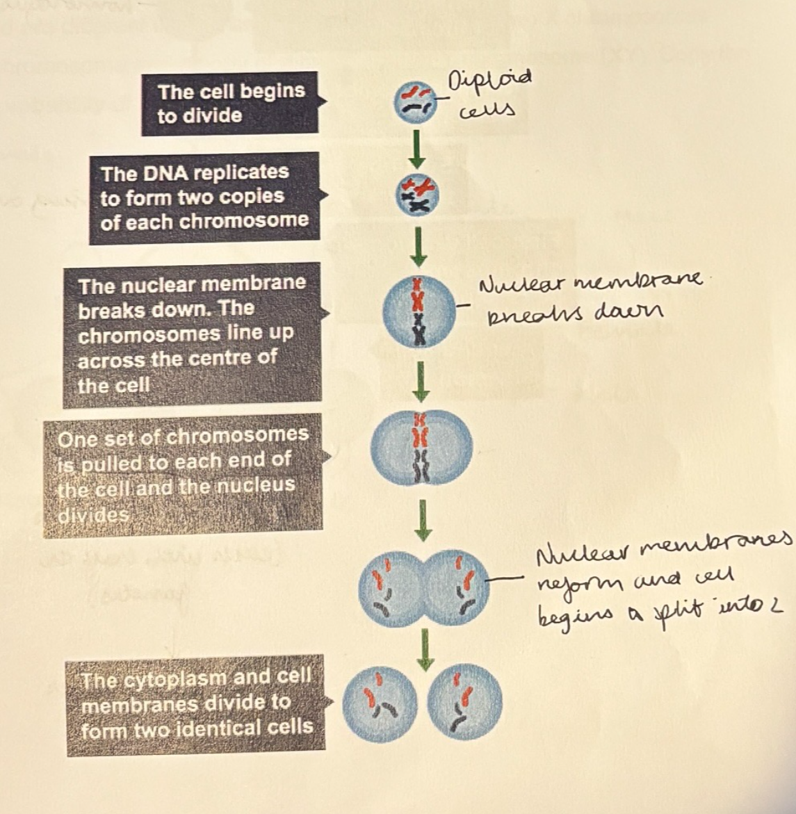Mitosis | Cell division – the cell divides once to form two genetically identical daughter cells.