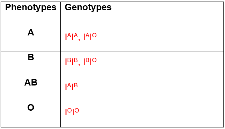 Blood groups also show co-dominance. There are three alleles IA and IB are co-dominant and IO is recessive. Complete the following tables for the possible genotypes of the four possible phenotypes.
