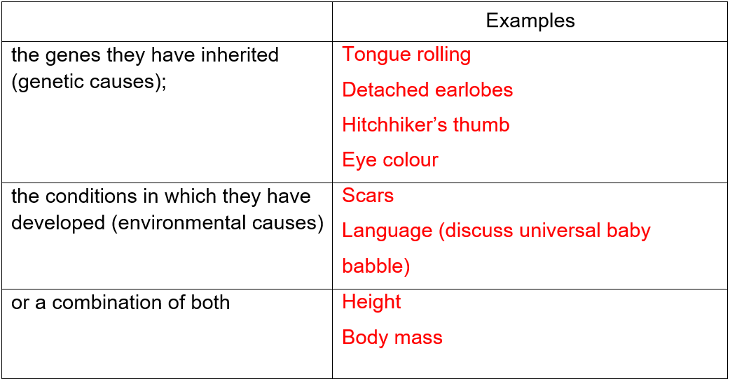 Examples: tongue rolling, detached earlobes, hitchhiker’s thumb, eye colour