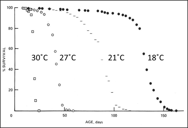 Effect of temperature on Drosophila population. For every change in approximately 10 degrees C, 2-3 fold change in lifespan.