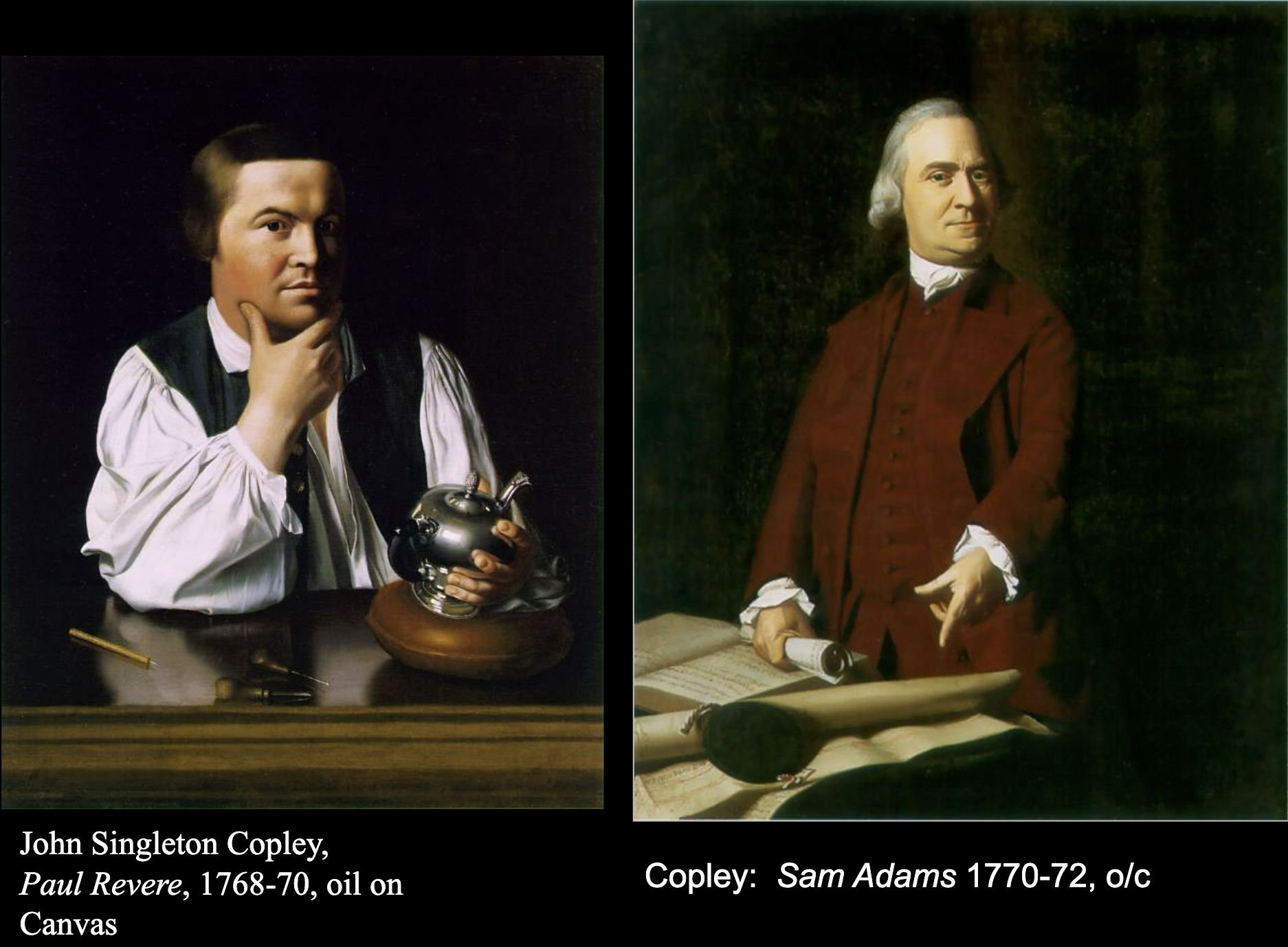 Paul Revere is in his working clothes, looking at his creation cause he’s a silver smith