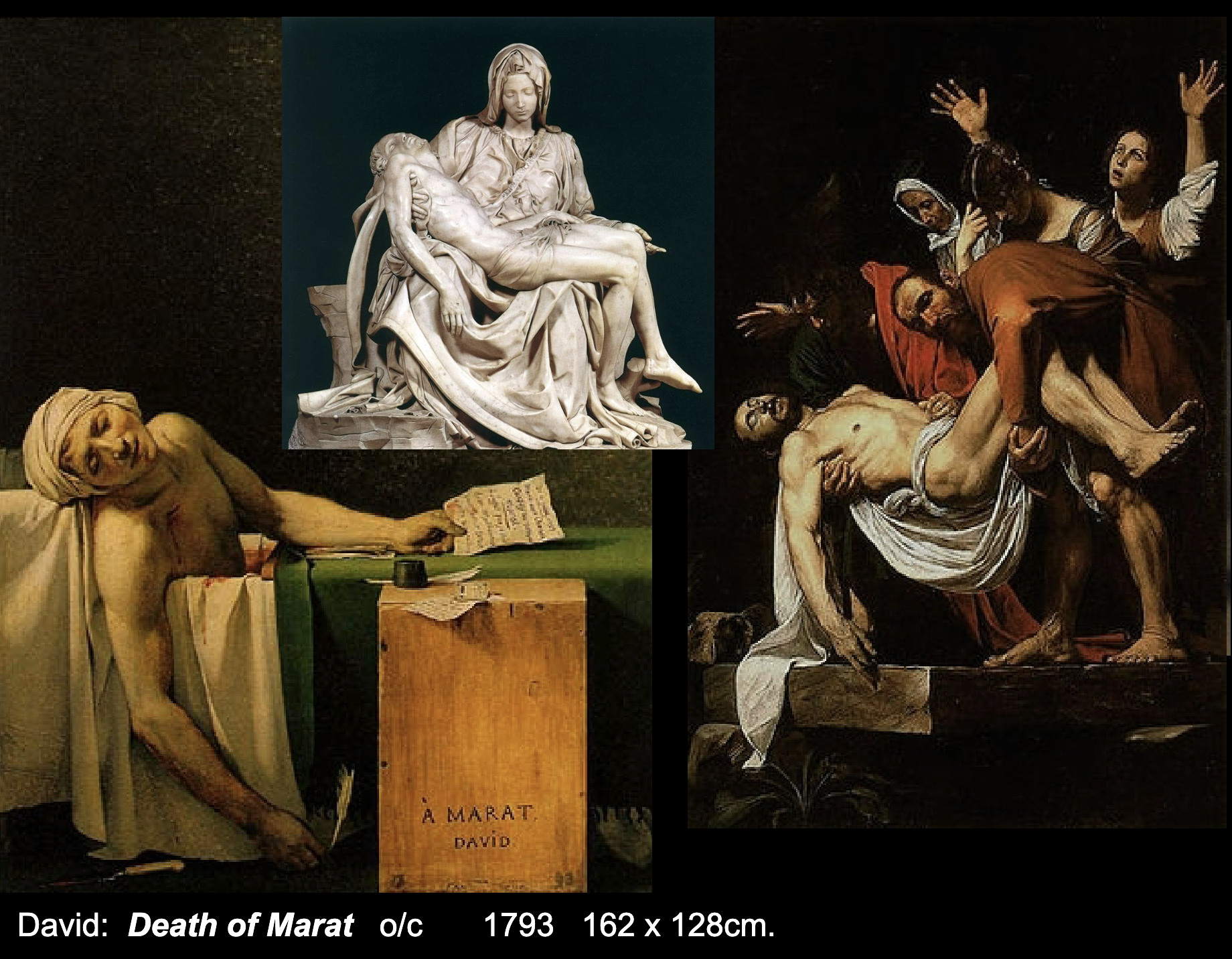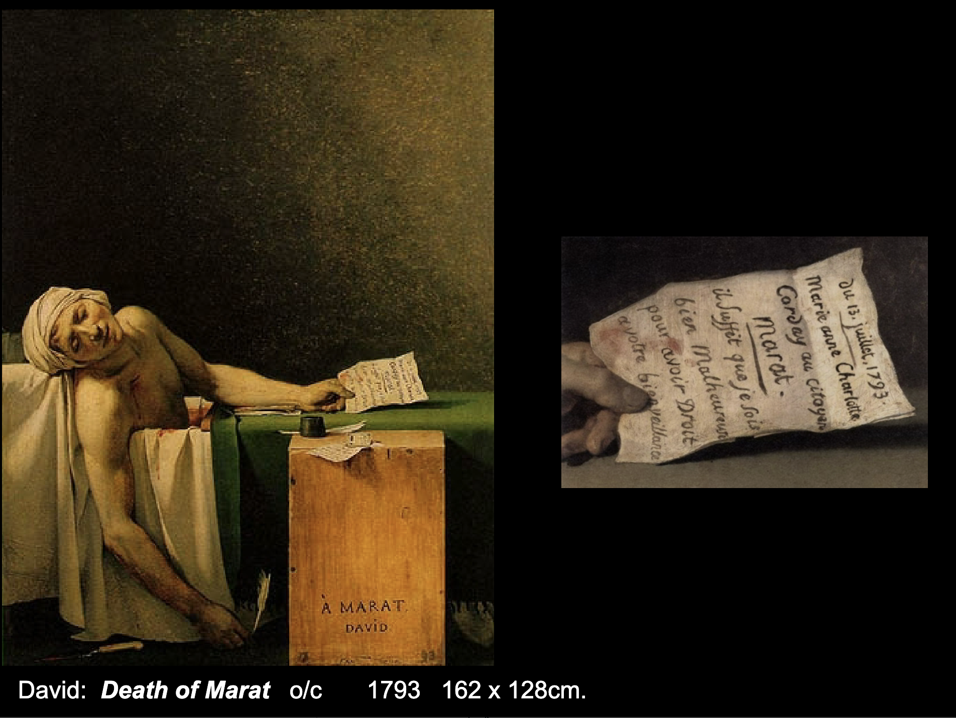 David is a friend of Marat who is killed by a the wife of a man accused of being a royalist