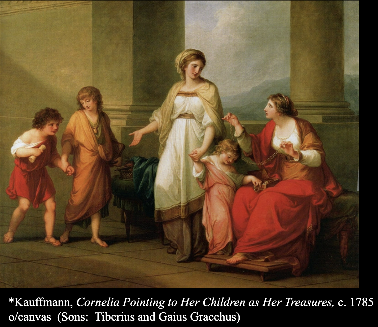 woman bragging about jewels asks Cornelia to show her jewels, she points to children (sons are revolutionaries)