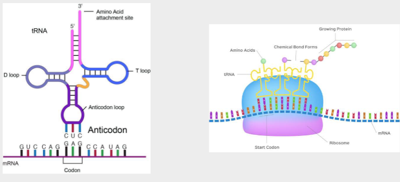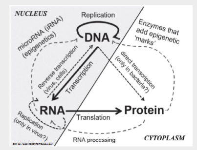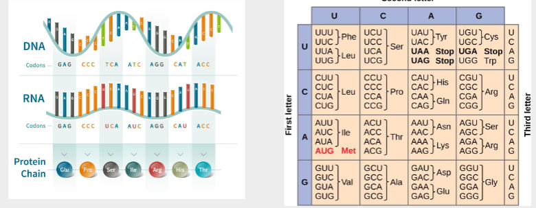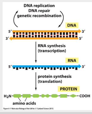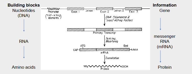 Then the information passes from mRNA to protein by translation (3 nucleotides contain the information for 1 amino acid)