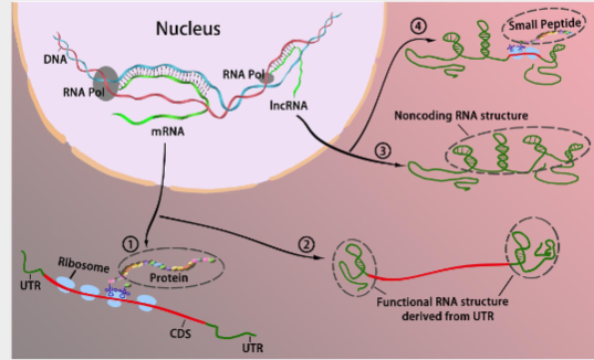 The interchangeable roles between coding and long coding RNAs. Traditionally RNAs could be divided into two categories in accordance with their coding potential, that is, coding RNA and non coding RNAs. Coding RNAs generally refers to mRNA that encodes a protein (1) to act as various components including enzymes, cell structures, and signal transductors. Noncoding RNAs act as cellular regulators without encoding proteins(3). Boundaries blur between coding RNA and noncoding RNA as some coding mRNA can function without translating to proteins via the formation of RNA secondary structure primarily derived from the UTR (2) some incRNA can bind with ribosomes and encode peptides to modulate cellular activities.