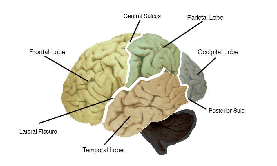 Gross divisions β left and right hemispheres β build up from grey matter (cell bodies) and white matter (axons) β Cerebellum, brain stem, cerebral cortex.