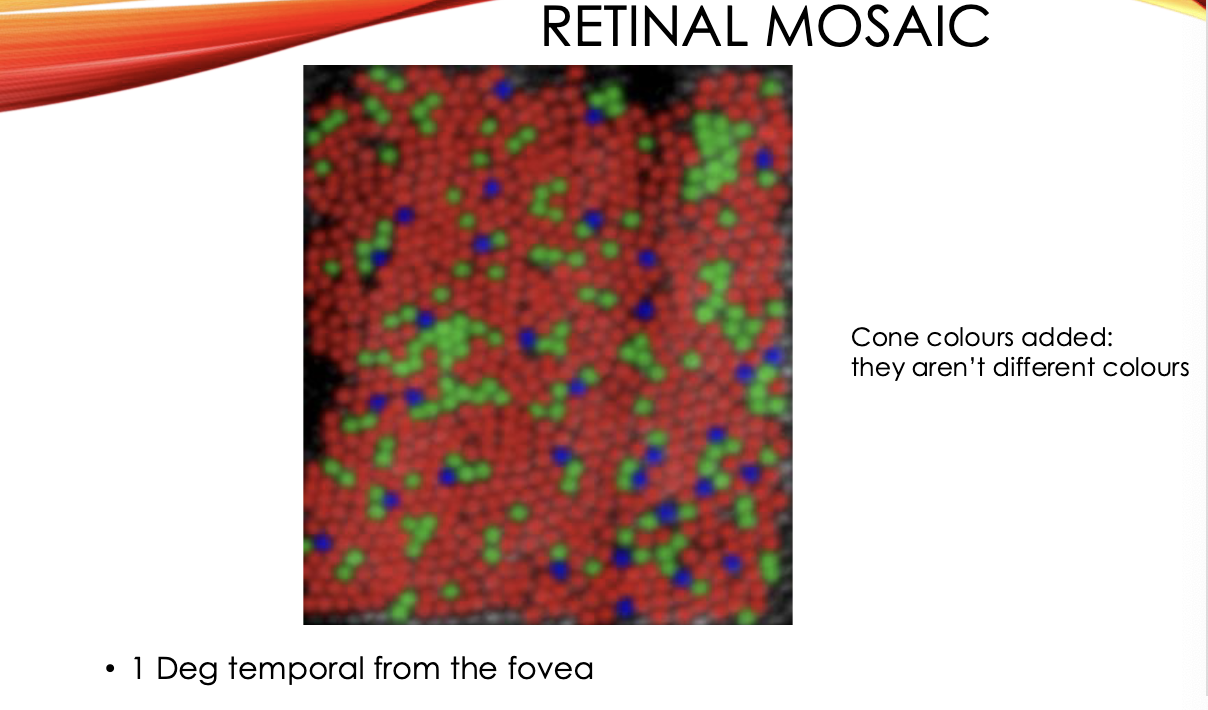 - Cones = colour detectors in your retina (red, green, blue types).