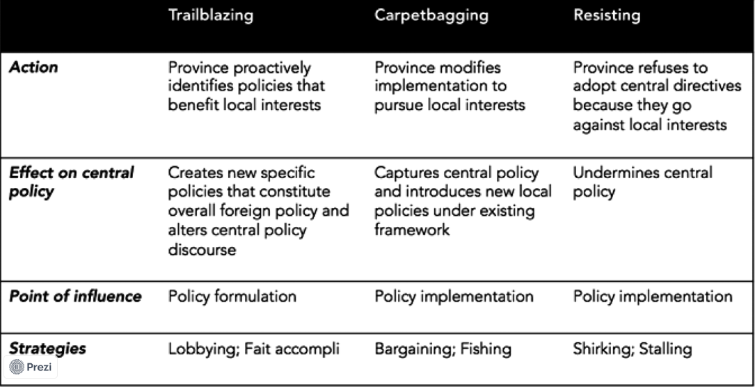 Chinese provinces – limited autonomy, but they can use this to interact with foreign governments (reflects a bottom-up approach)