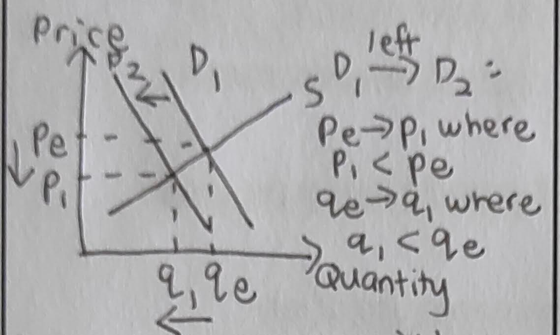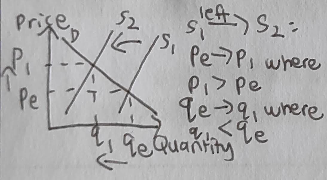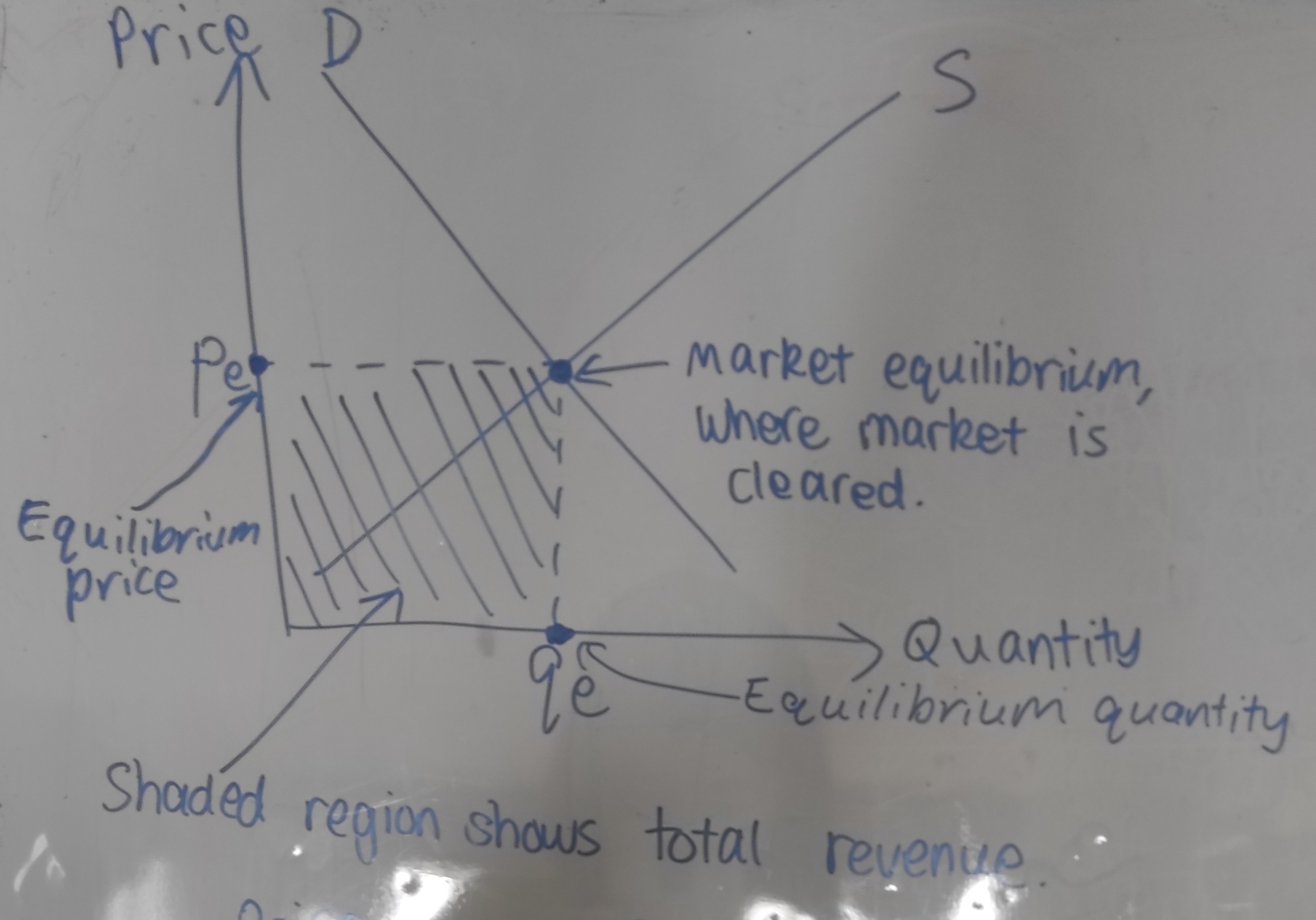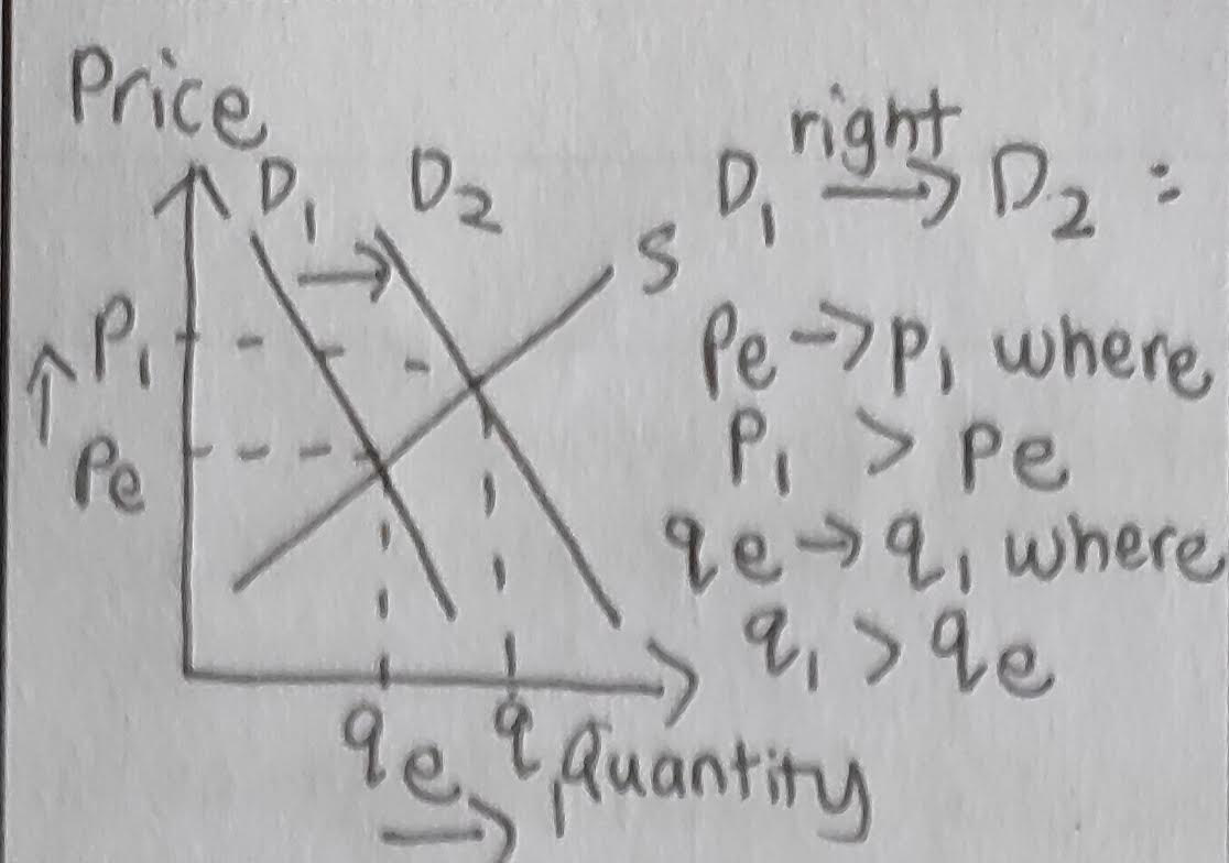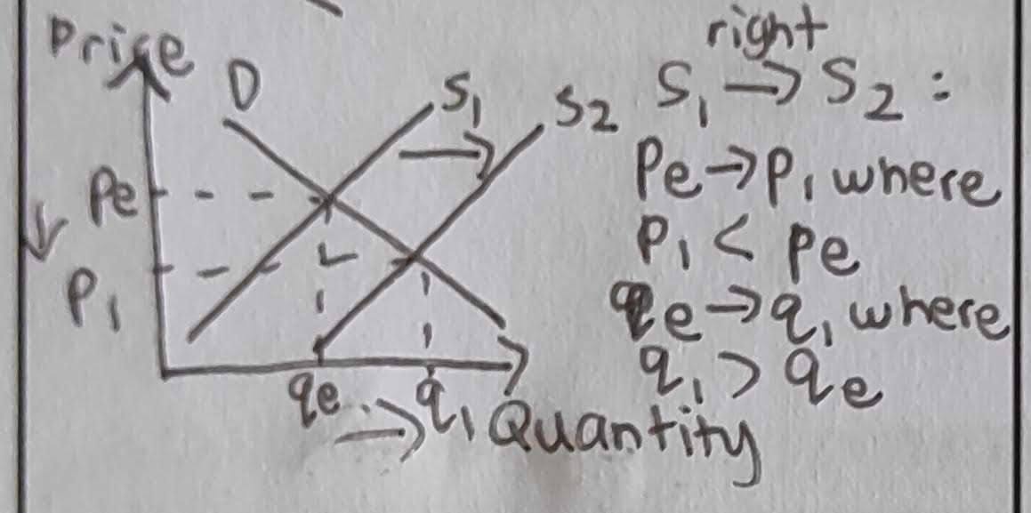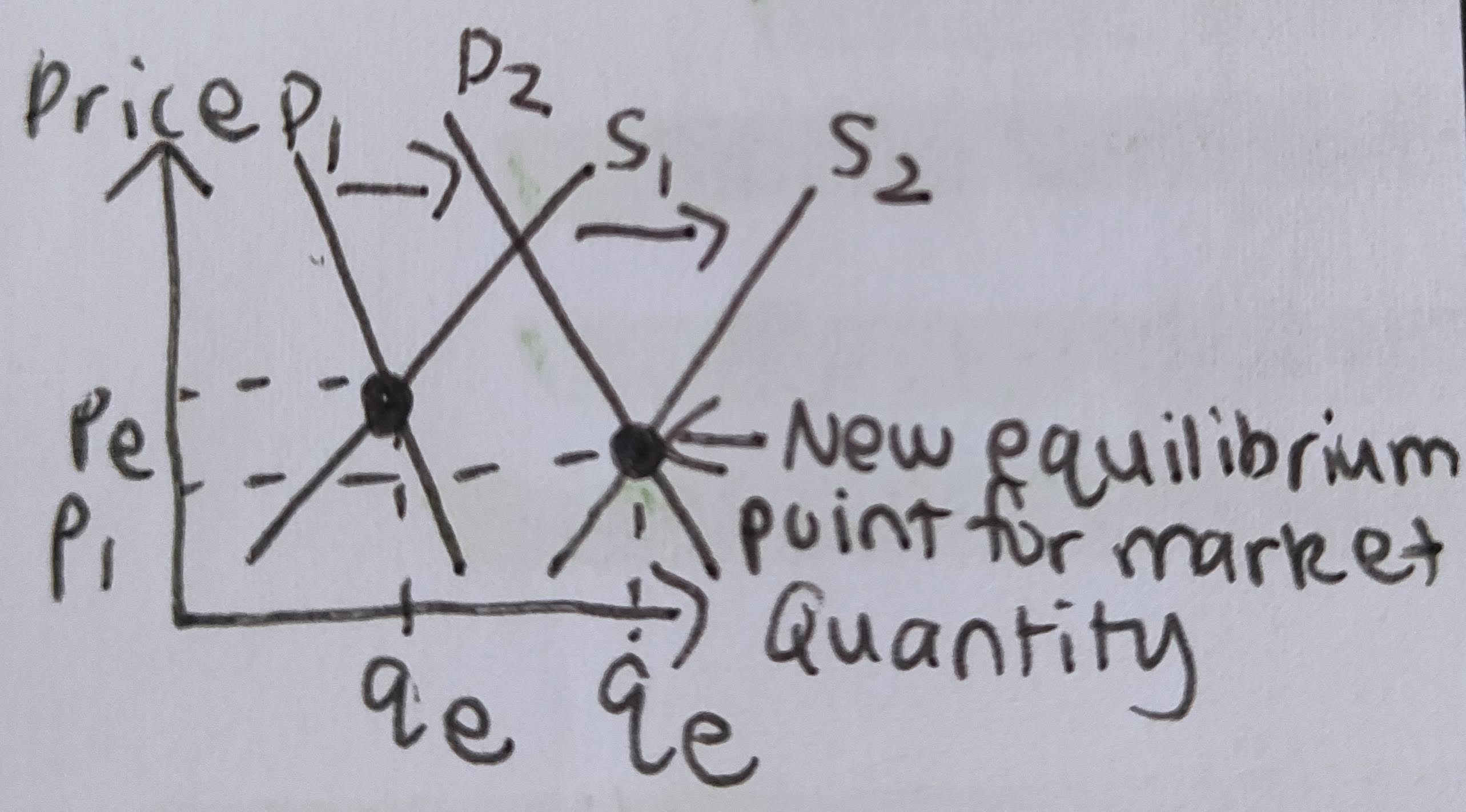 == = Money paid by government/organization to encourage production of a good/service.↑Subsidies → ↓Production cost → ↑Supply↓Subsidies → ↑Production cost → ↓SupplyEquilibrium Price and Quantity - Syllabus 1.1.3(g)==**Equilibrium price (Market clearing price)****== = Price where the quantity supplied = quantity demanded.Price at intersection of demand and supply curve for the same product.==Cleared market== = Amount supplied in market is completely bought by all consumers; no buyers left without goods, no sellers left with unsold stock.==**Equilibrium quantity***== = Quantity of a good supplied in the market which is equal to demanded quantity.Quantity at intersection of demand and supply curve for the same product.==Total revenue== = Total money earned from selling goods/services = Price/unit * Quantity of units.Market Equilibrium Diagrams - Syllabus 1.1.3(h)==Right demand shift== → ↑Equilibrium price & ↑Equilibrium quantity==Left demand shift== → ↓Equilibrium price & ↓Equilibrium quantity==Right supply shift== → ↓Equilibrium price & ↑Equilibrium quantity==Left supply shift== → ↑Equilibrium price & ↓Equilibrium quantityDemand and supply curves can shift==simultaneously==.Defining, drawing, and calculating excess demand and excess supply - Syllabus 1.1.3(i)