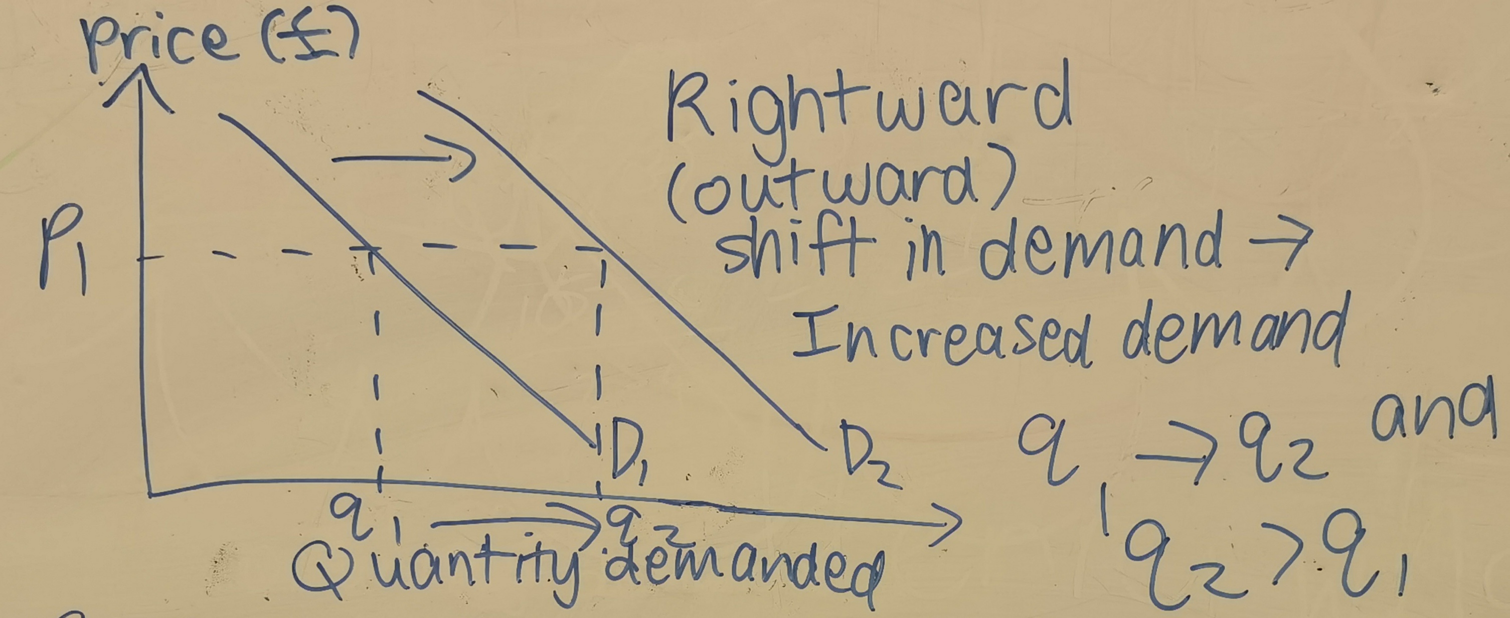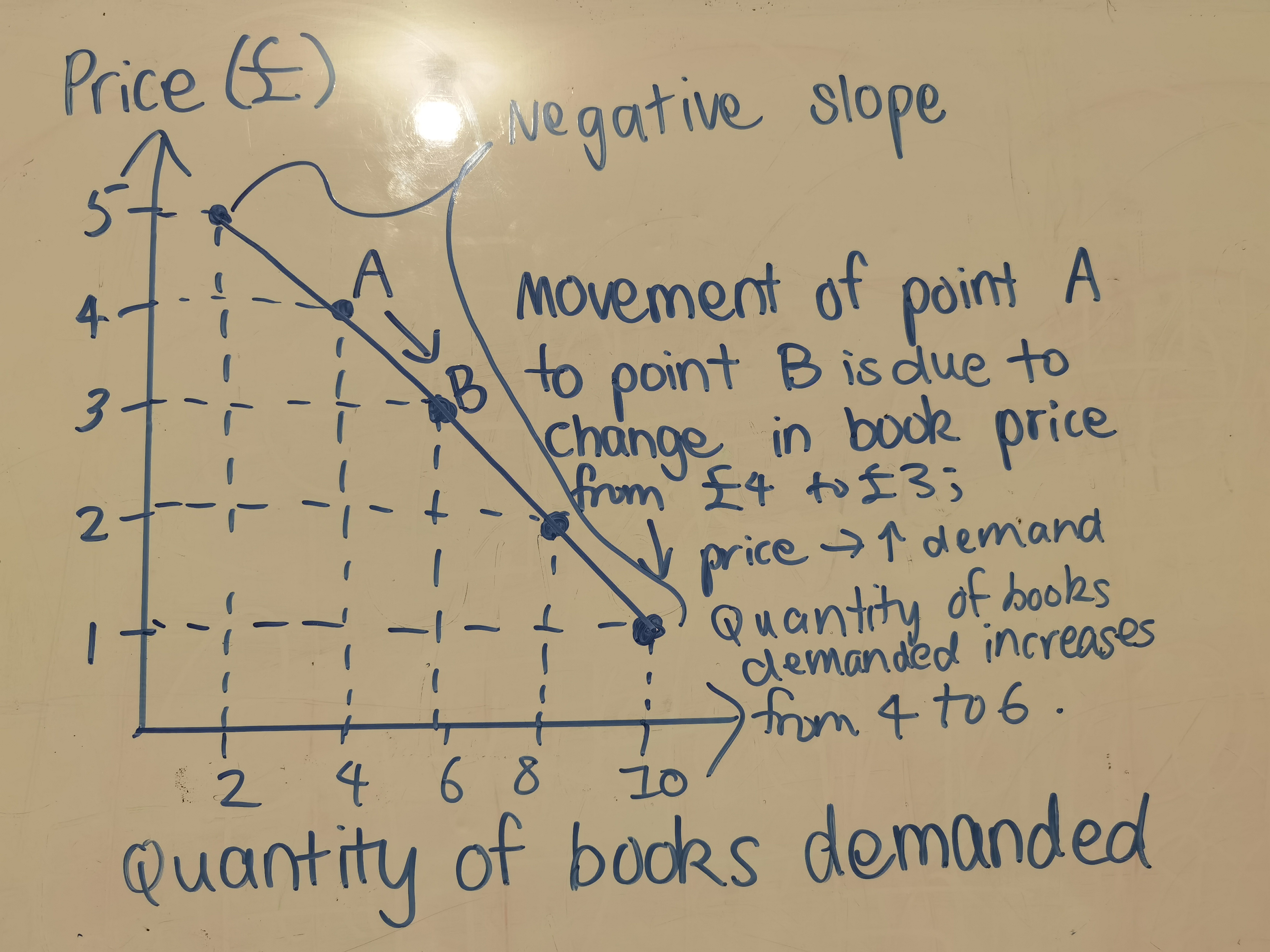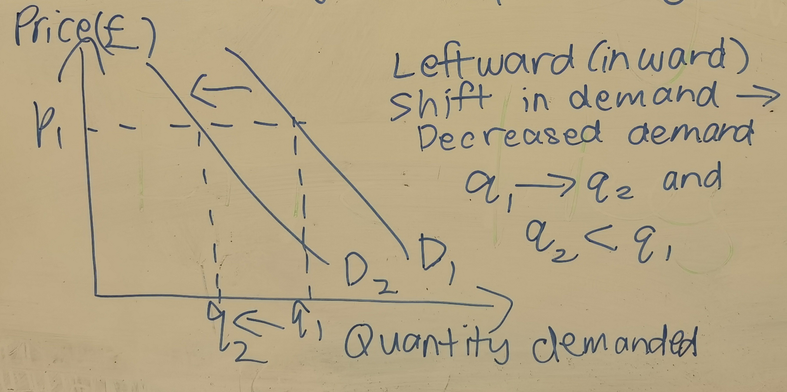 ==**Inverse relationship**** == for price & amount demanded:↑ price → ↓ quantity demanded↓ price → ↑ quantity demanded^^**Change in price of originally-investigated good**^^→ Movement along demand curve==**Factors NOT related to change in price of originally-investigated good*** == → Shift in demand curve==**Rightward/outward demand shift*** * == → ↑ demand==**Leftward/inward demand shift*** == → ↓ demandPrice is ALWAYS on==**y-axis.**==Quantity demanded is ALWAYS on==x-axis.==Example:==Demand schedule