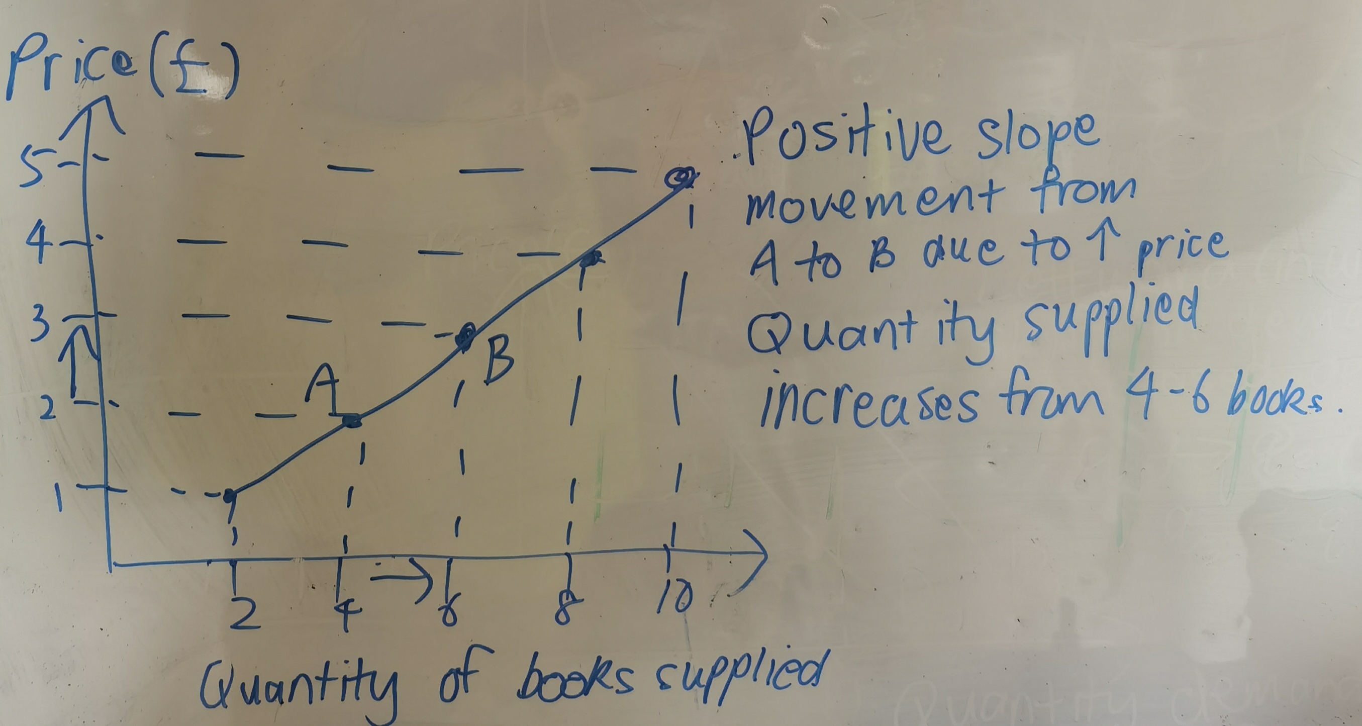 ==**x-axis.**Example:==Supply schedule* = Table of the quantity supplied of a good at different price levels, used to calculate expected quantity supplied and plot points on supply curve.Example:Price (£) of BooksQuantity of books supplied12243648510==Fixed supply*== = Supply stays the same regardless of price because it is impossible to increase supply even when price increases, due to a fixed quota.E.g. the number of tickets to seats in a stadium, as the capacity is constant.Factors causing Shifts in the Supply Curve - Syllabus 1.1.3(f)Use==PINNS== acronym:==Production cost - Inversely proportional to supply==Production cost = Price of producing a good/service.e.g. machinery costs (capital), wages (labour), raw materials (land).↑Production cost → ↓ Supply (Less profit incentive)↓Production cost → ↑ Supply (More profit incentive)