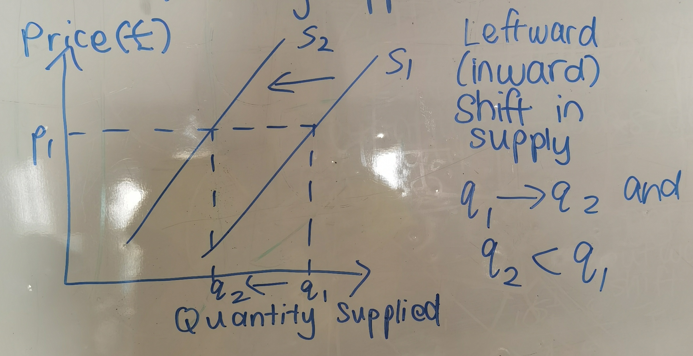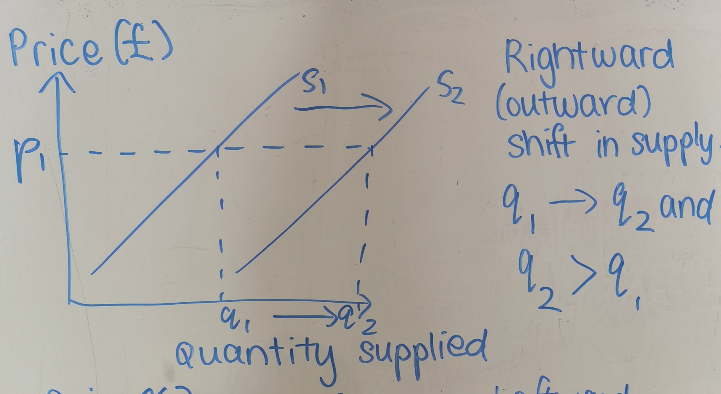 == → Shift in supply curve.==Rightward/outward supply shift== → ↑ supply==Leftward/inward supply shift== → ↓ supplyPrice is ALWAYS on==y-axis.==Quantity supplied is ALWAYS on