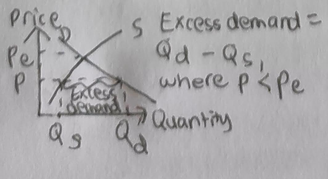 - ==Excess demand**== = Quantity demanded - Quantity suppliedQuantity demanded > Quantity supplied → Supply shortages → Consumers left without goods.Happens when price < equilibrium price.==Excess supply**== = Quantity supplied - Quantity demandedQuantity supplied > Quantity demanded → Demand shortages → Producers left with unsold goods.Happens when price > equilibrium price.Restoring Market Equilibrium - Syllabus 1.1.3(j)==Market disequilibrium