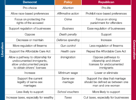 The parties disagree over a variety of policies, and it would be hard to list them all here. However, in the topics below the party’s stances on each issue will be described.