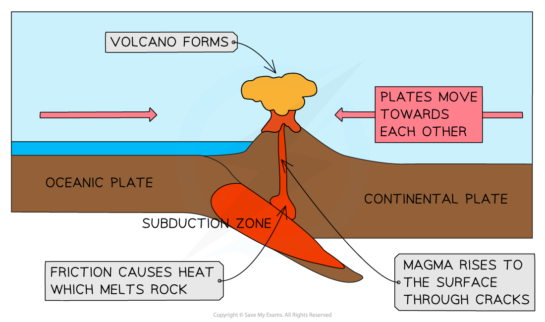 destructive plate boundary is where a denser, thinner oceanic plate (plates which carry ocean on top, they cover the ocean floor and are primarily built of basalt.) is subducted under a lighter, thicker oceanic plate (the plate which carries land). when the oceanic plate sinks into the mantle, it melts to form magma. the pressure of the magma is built up beneath the earths surface, then the magma escapes through weaknesses in the rock and rises up through a composite volcano. The volcanic eruptions are often violent, with lots of steam, gas and ash.