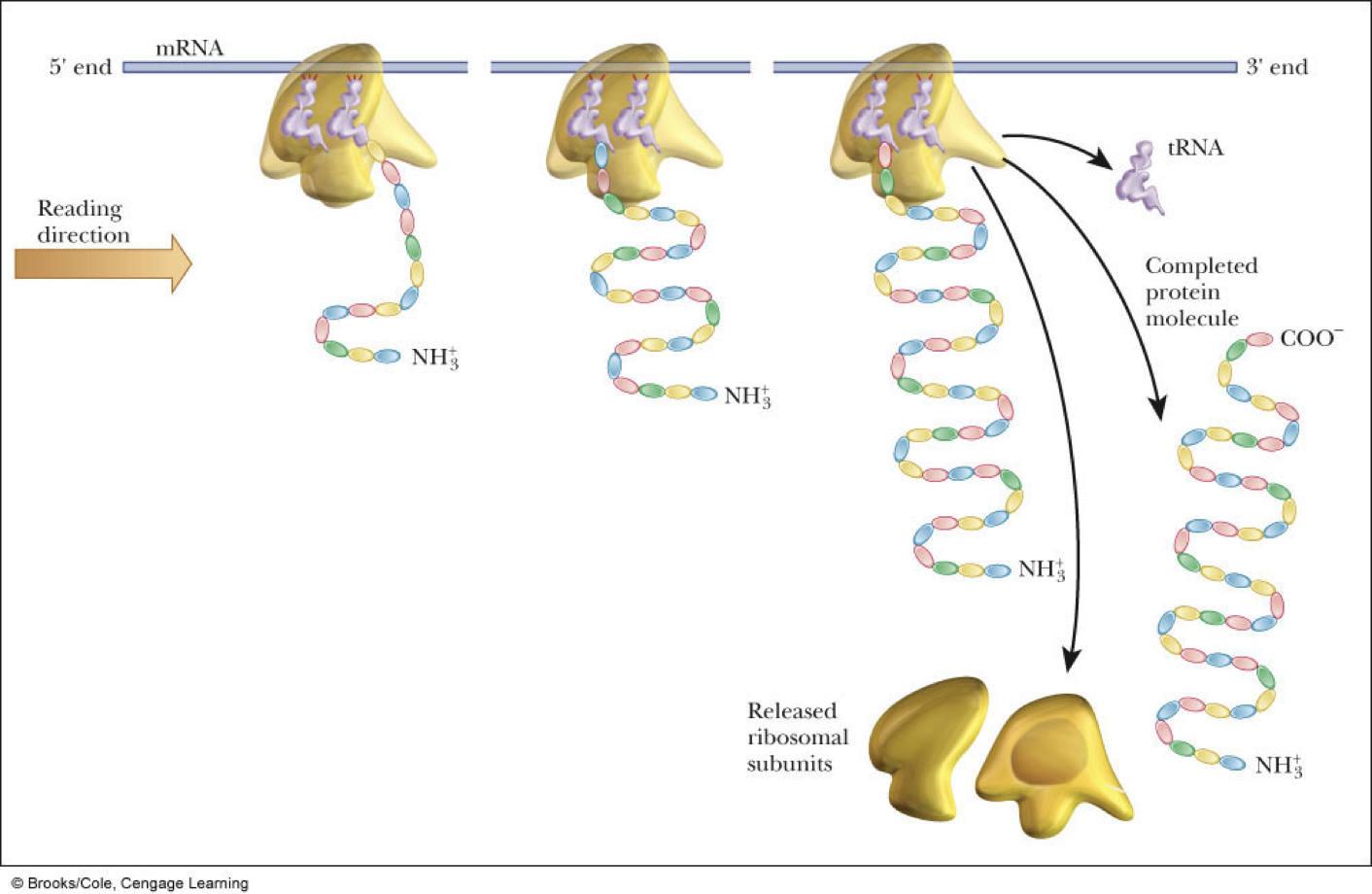 - When protein has been completed, the ribosome dissociates into subunits that are used again in protein synthesis