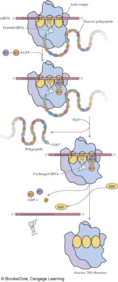 - Chain termination requires * stop codons (UAA, UAG, or UGA) of mRNA * RF-1 (Release factor-1) which binds to UAA and UAG or RF-2 (Release factor-2) which binds to UAA and UGA * RF-3 which does not bind to any termination codon, but facilitates the binding of RF-1 and RF-2 * GTP which is bound to RF-3
