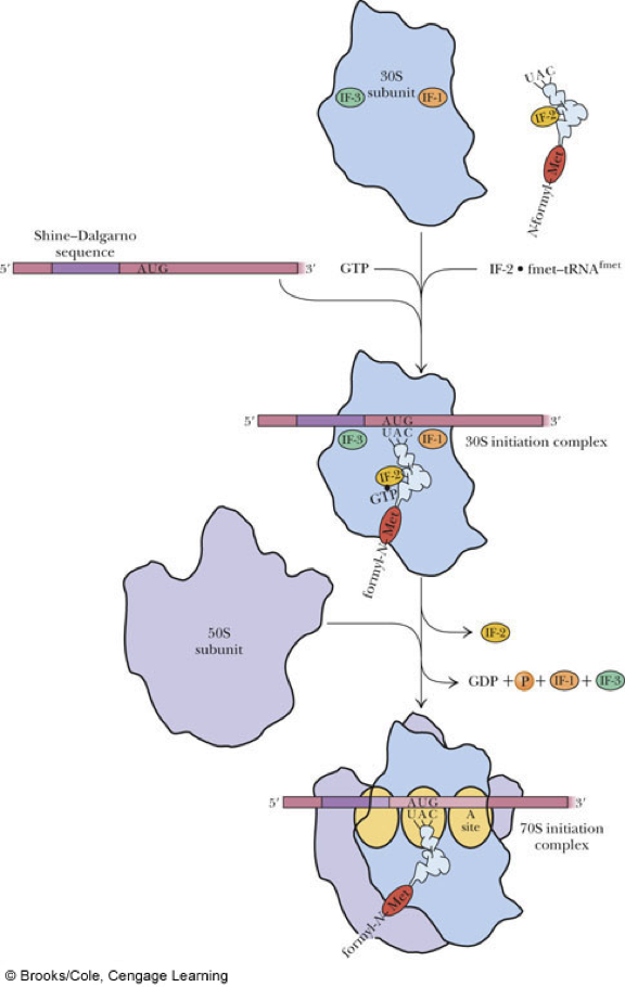 - Initiation requires: * tRNAfmet * initiation codon (AUG) of mRNA * 30S ribosomal subunit * 50S ribosomal subunit * initiation factors IF-1, IF-2, and IF-3 * GTP, Mg2+